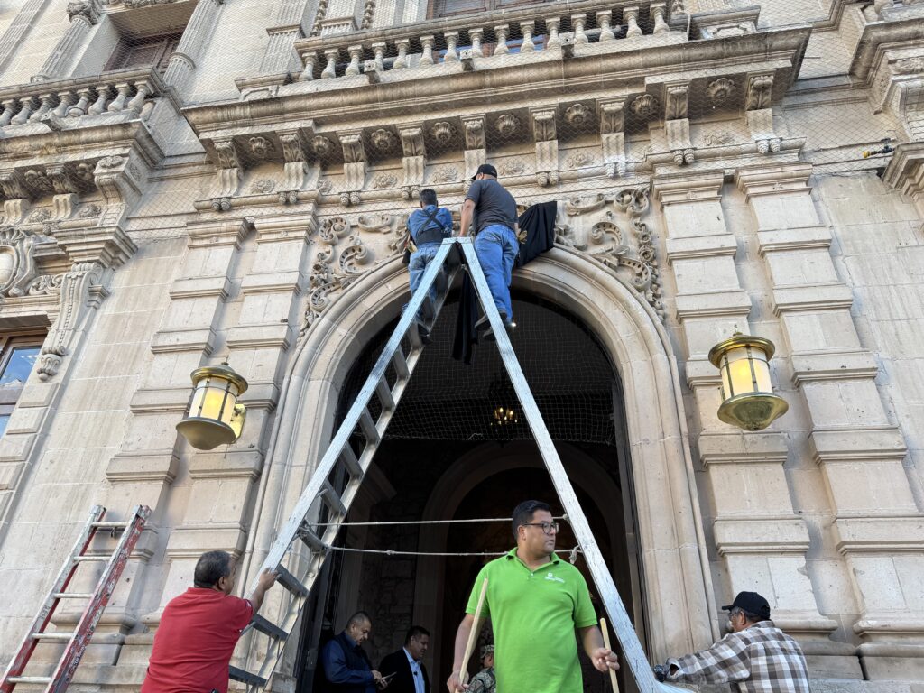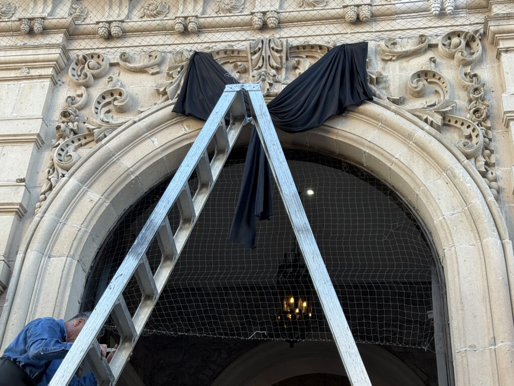 A una semana del fallecimiento del empresario Víctor Cruz Russek, personal de Palacio de Gobierno colocó moños de luto en los accesos del edificio.