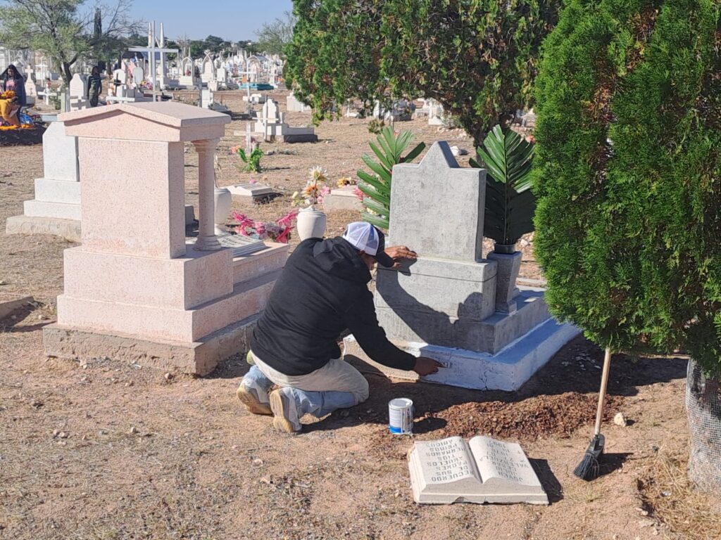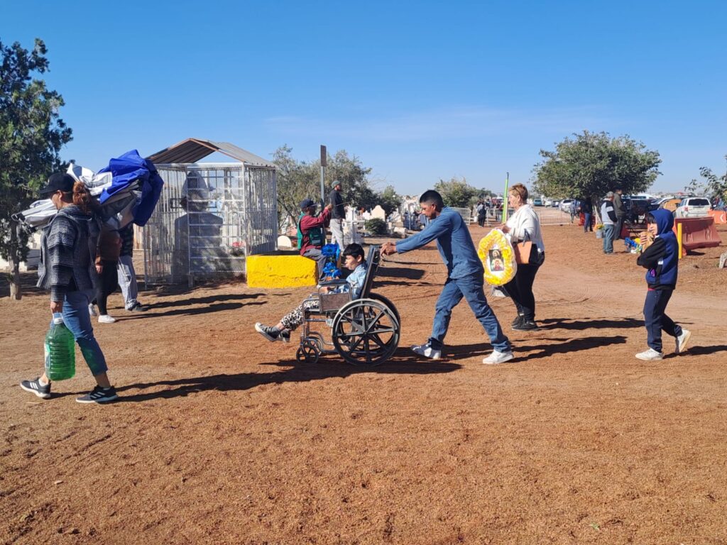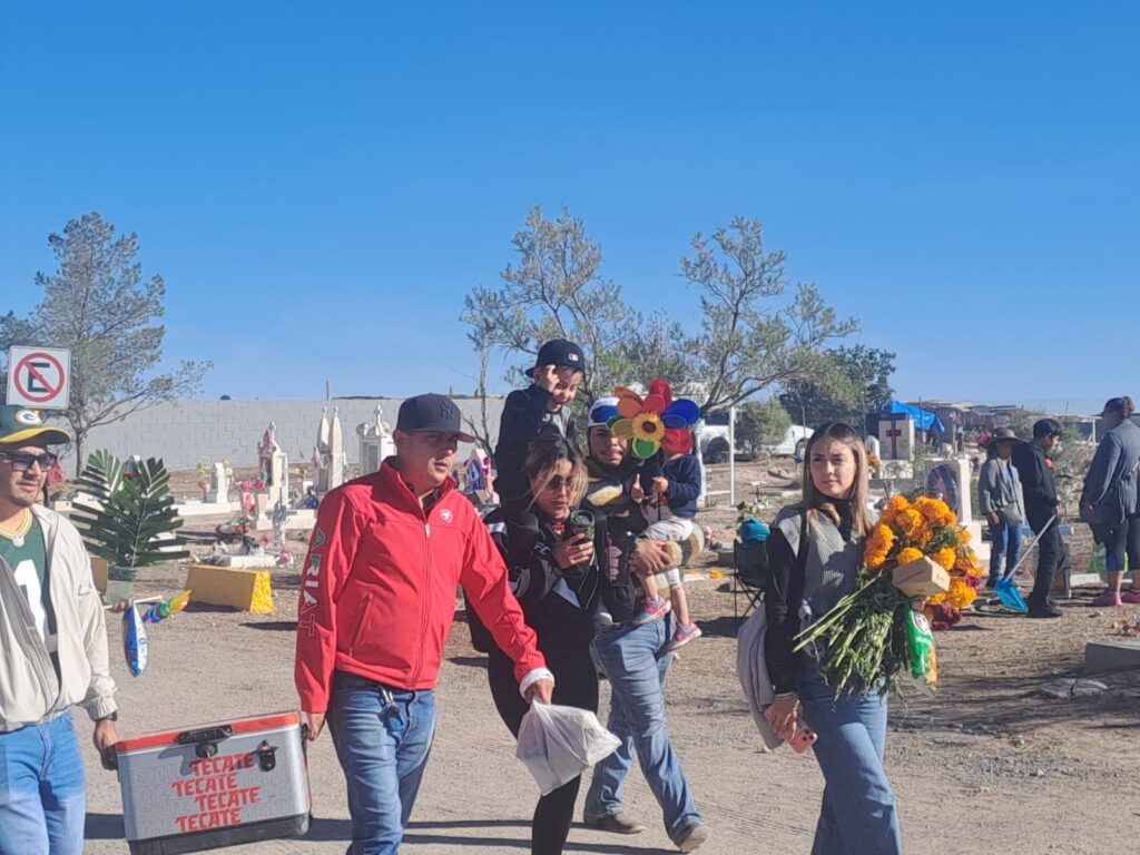 Durante el transcurso de la misa, cientos de juarenses llegaban con palas, escobas, cubetas, bocinas y los tradicionales arreglos florales como coronas, ramos y otros artículos para adornar las tumbas.