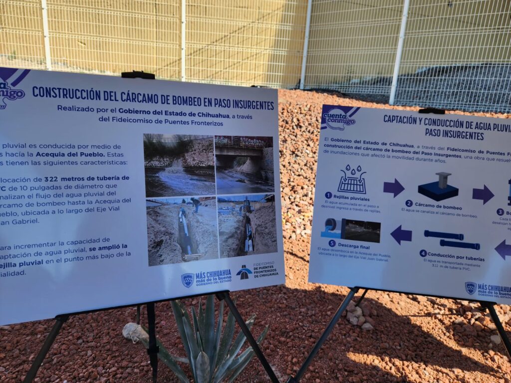 A través del Fideicomiso de Puentes Fronterizos de Chihuahua (FPFCH), se concluyó la construcción del cárcamo de bombeo del Paso Insurgentes, una obra con inversión superior a 12.3 millones de pesos que pone fin a una problemática histórica de inundaciones a un sector del norponiente de la ciduad.