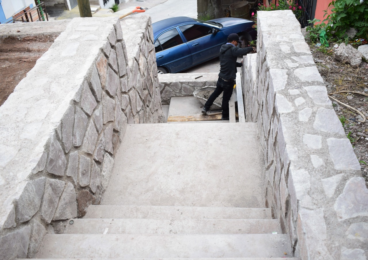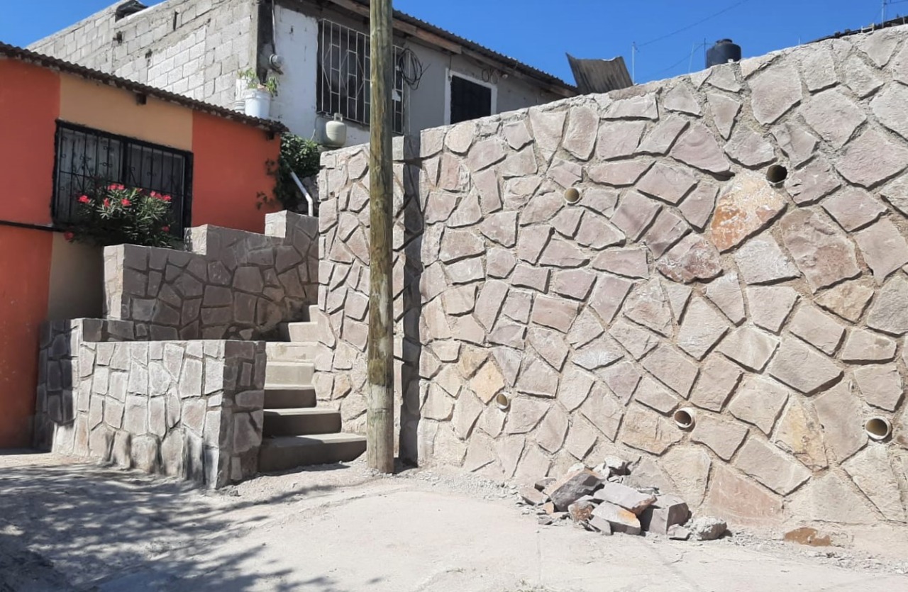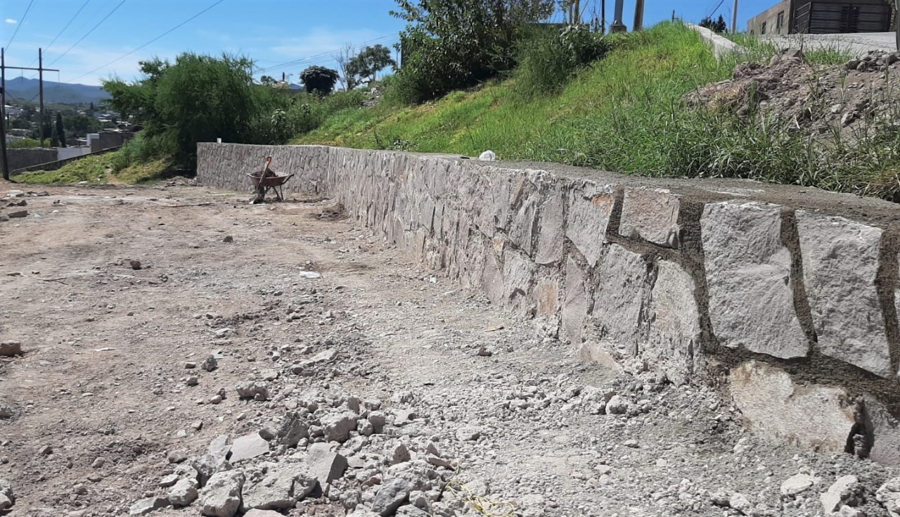 La construcción del muro de contención de mampostería, ubicado en la calle Río Chuviscar, contó con excavaciones, rellenos de banquetas, accesos para las personas que viven en esta zona, la colocación de una cubierta de concreto y la instalación de un barandal de protección.