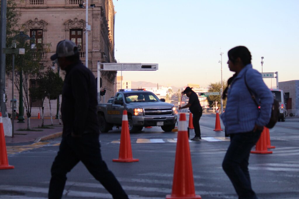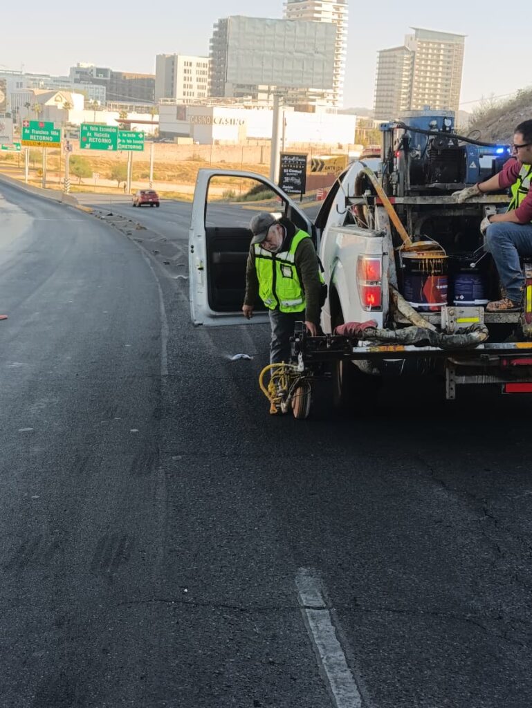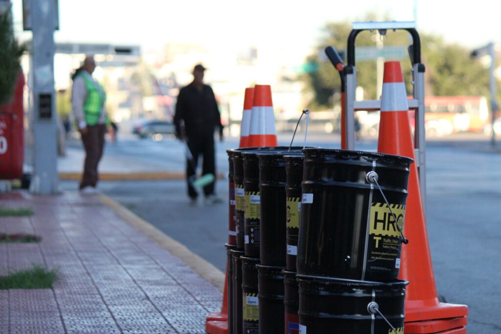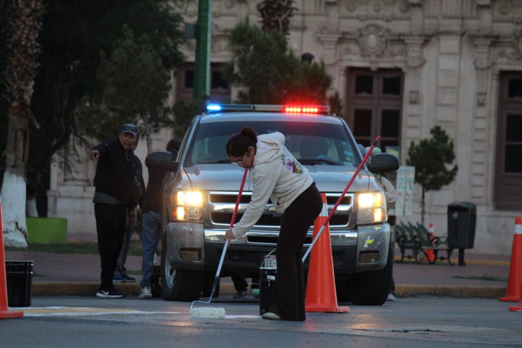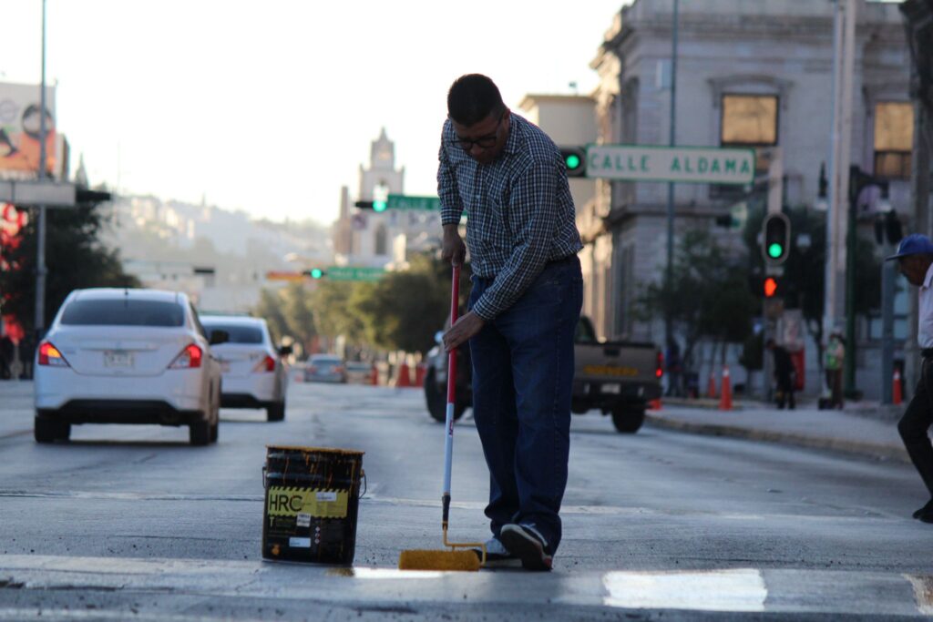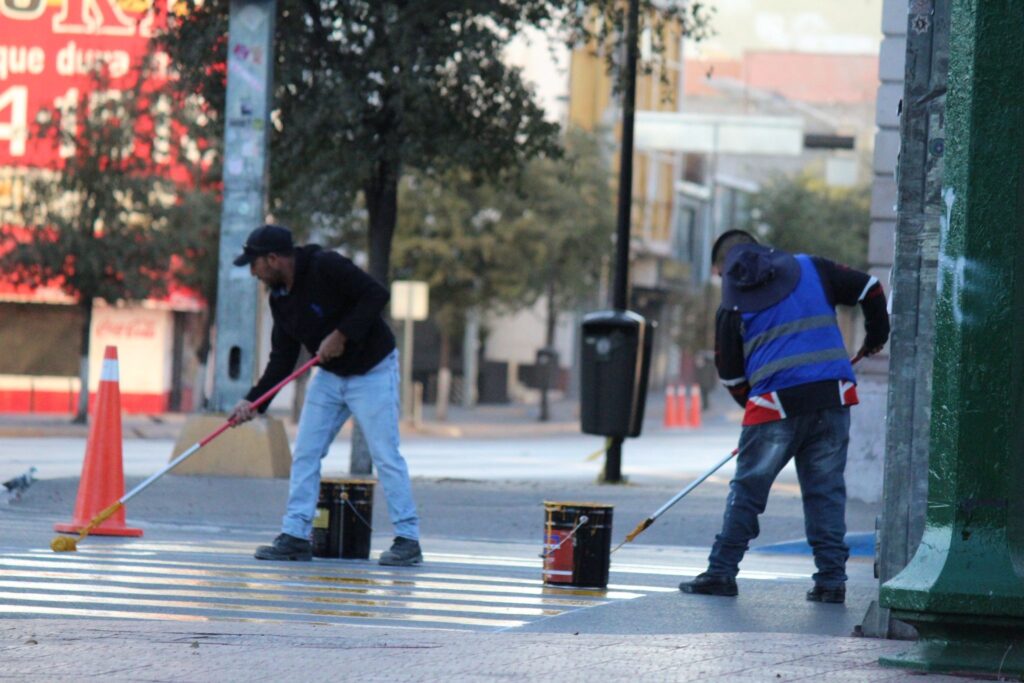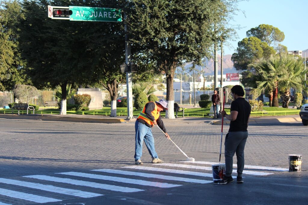 El personal de Movilidad inició los trabajos desde primera hora en zonas clave de la capital, entre las que destacan el primer cuadro de la ciudad y el Periférico de la Juventud, en las cercanías de Distrito 1, donde se realizaron labores de mantenimiento y renovación de pintura para pasos peatonales.