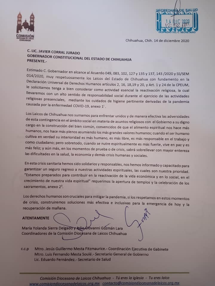 Además, la Comisión Diocesana de Laicos también envió una carta al gobernador Javier Corral, en donde le exponen sus argumentos para que les permita reabrir los templos.