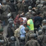 Después de que la caravana, que tiene unos 6,000 miembros según la policía, insistiera en avanzar, los agentes usaron el gas lacrimógeno, haciéndola retroceder unos 200 metros.