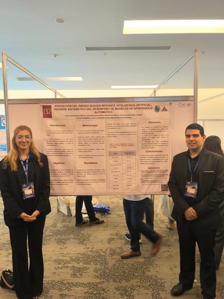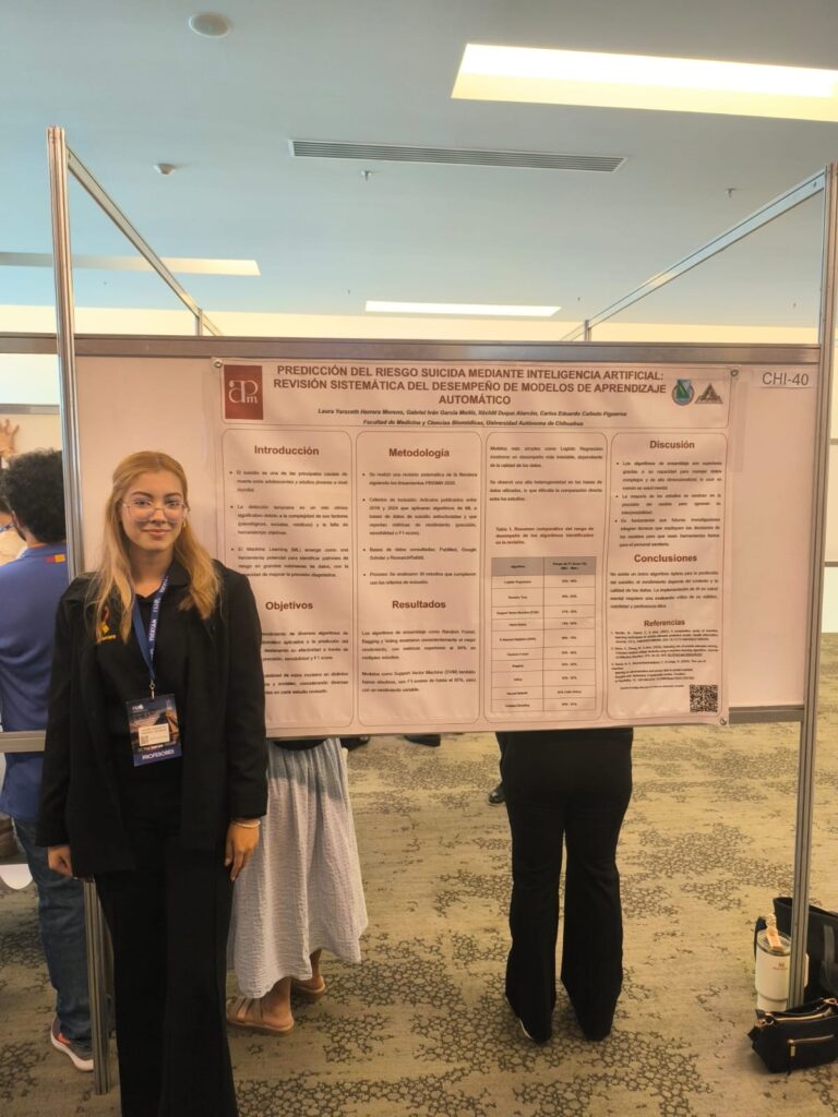 La segunda vertiente, en el Hemisferio Izquierdo, estuvo a cargo del Dr. Carlos Eduardo Cañedo Figueroa, junto a los estudiantes de Ingeniería Biomédica Laura Yarazeth Herrera Moreno y Gabriel Iván García Muñiz. Su investigación, «Predicción del riesgo suicida mediante inteligencia artificial: revisión sistemática del desempeño de modelos de aprendizaje automático», se deriva de una serie de estudios colaborativos realizados con personal del Hospital de Salud Mental del Estado de Chihuahua, personal sanitario del ISSSTE y académicos de la UACH, destacando el trabajo interdisciplinario en una problemática de alto impacto social.
