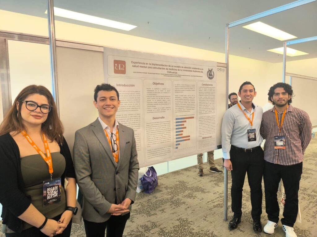 Los carteles se presentaron en dos vertientes: la primera, en el Hemisferio Derecho, estuvo dirigida por la Dra. Xóchitl Duque Alarcón, acompañada por los estudiantes Jesús Quintana Andrade, Pamela Alejandra Gutiérrez Gómez, Jesús Roberto Burboa Martínez y Ricardo Arredondo Cárdenas. Su trabajo, titulado «Experiencia en la implementación de un modelo de atención colaborativa en salud mental para estudiantes de medicina de la Universidad Autónoma de Chihuahua», obtuvo el 3.er lugar en el concurso de Carteles de Socio en Adiestramiento, un reconocimiento que resalta la calidad e impacto de esta propuesta.