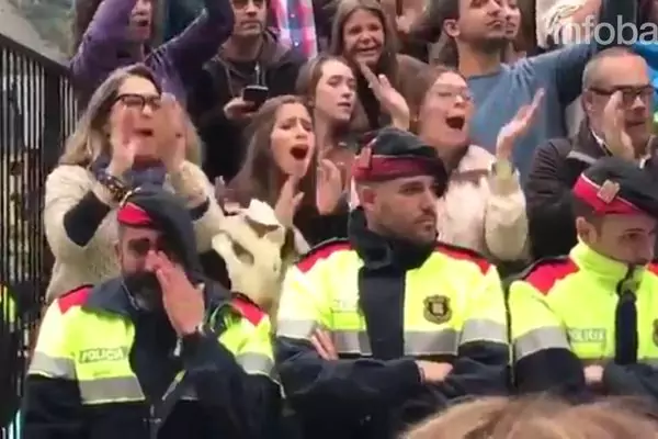 Algunos de los mossos que formaban parte del cordón policial se desbordaron de la emoción cuando los concentrados comenzaron a aplaudir y a vitorear a los agentes.