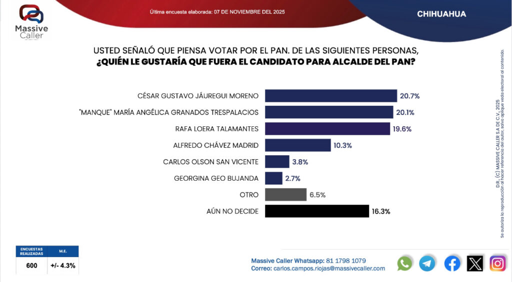 La más reciente encuesta de Massive Caller por la alcaldía de Chihuahua capital, en donde el PAN como partido político aparece en primer lugar de las preferencias electorales, revela un empate técnico entre los tres primeros lugares por la candidatura panista a la Presidencia Municipal.