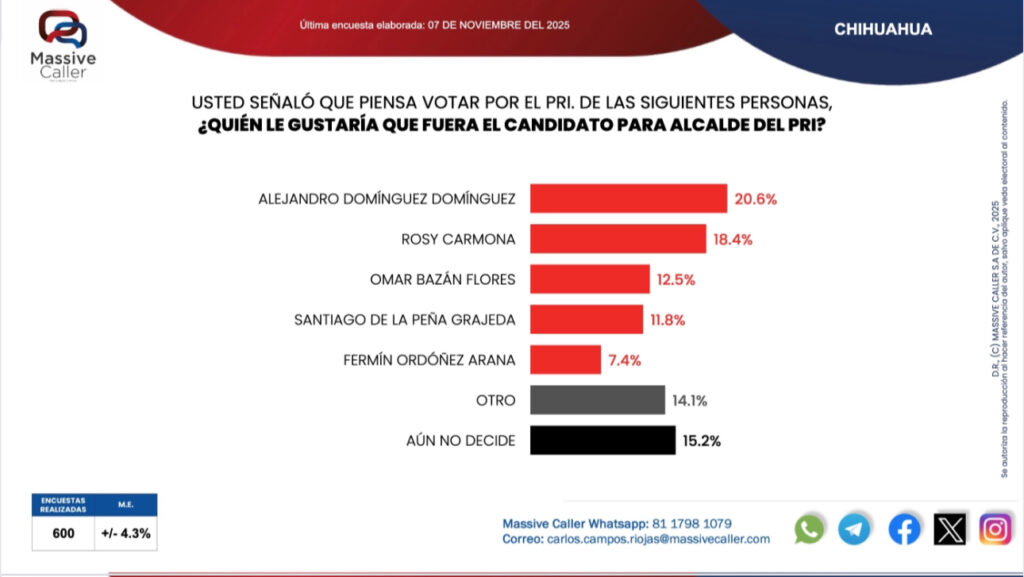 Por el PRI, quien lidera las preferencias según Massive Caller es el diputado federal Alex Domínguez, con el 20.6 por ciento, seguido por la regidora Rosy Carmona, el exdiputado local Omar Bazán, el secretario General de Gobierno, Santiago de la Peña y el líder estatal de Movimiento Territorial, Fermín Ordóñez.