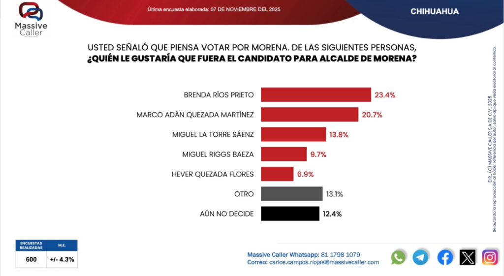 En el caso de Morena, la diputada local Brenda Ríos encabeza las preferencias con el 23.4 por ciento, seguida por los excandidatos a la alcaldía de la capital en 2021 y 2024, Marco Quezada y Miguel La Torre, en ese orden, mientras que el regidor Miguel Riggs y el funcionario federal Hever Quezada completan la lista.