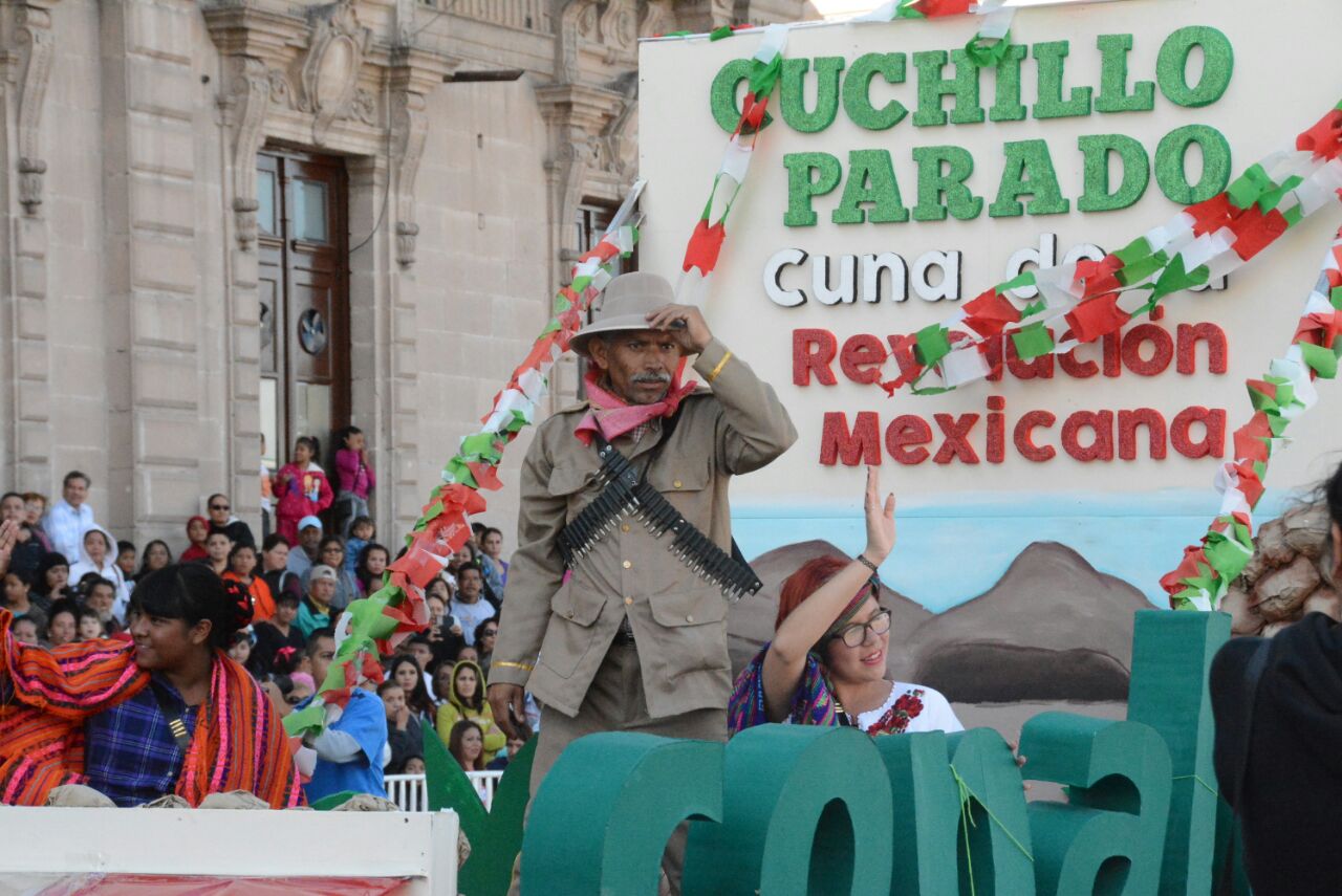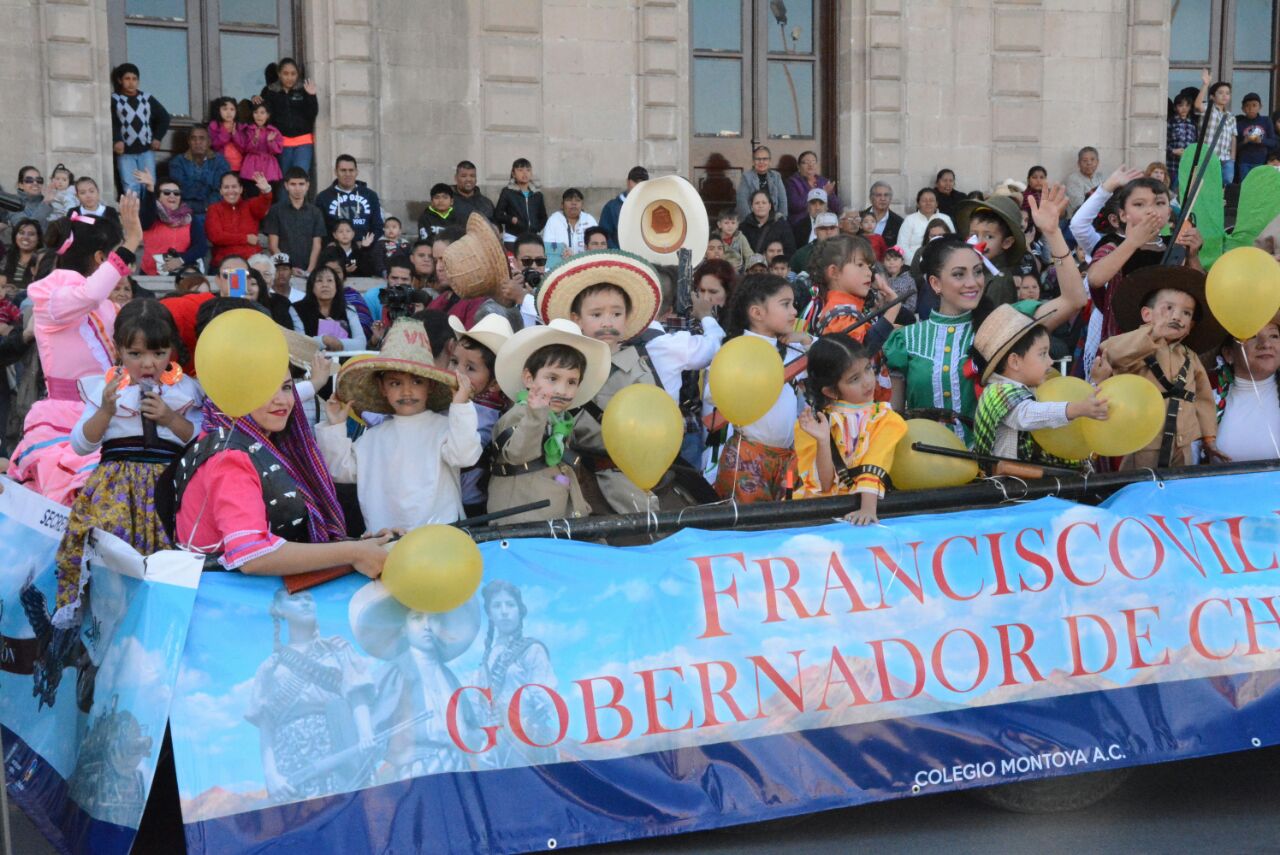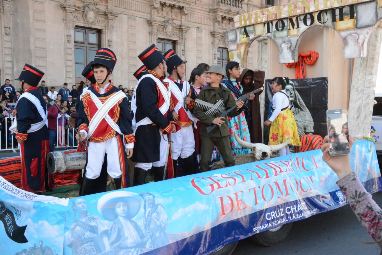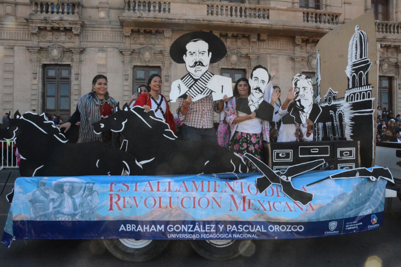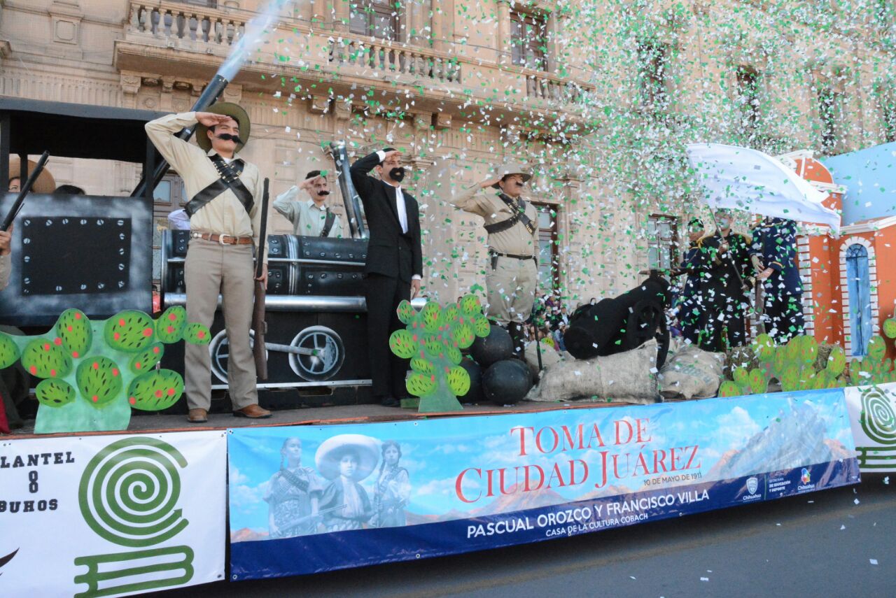 Asimismo se contó con 10 carros alegóricos temáticos, en los cuales los alumnos y alumnas recrearán pasajes históricos del movimiento revolucionario, como son la gesta heroica de Tomochi, el levantamiento armado en Cuchillo Parado, el inicio de la Revolución Mexicana, la toma de Ciudad Juárez, Francisco Villa como Gobernador de Chihuahua, la batalla de Ojinaga, la batalla y toma de Zacatecas, el ataque a Columbus, Nuevo México, la promulgación de la Constitución Política de los Estados Unidos Mexicanos, y las tradiciones mexicanas.