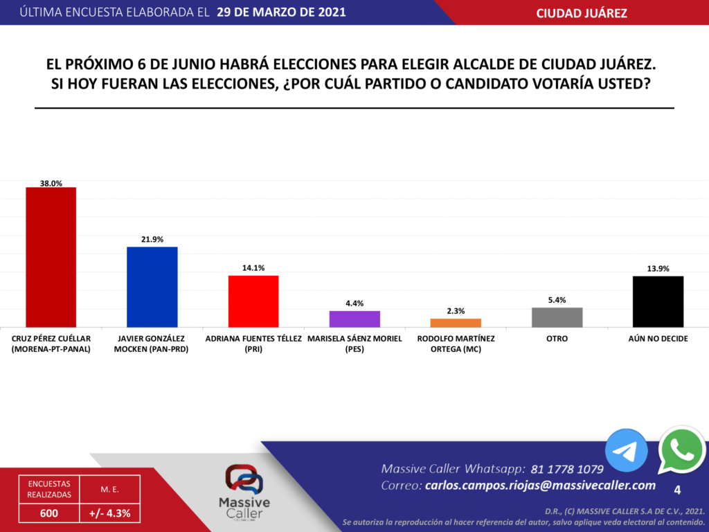 La encuestadora coloca al candidato morenista a la presidencia municipal de Juárez, Cruz Pérez Cuellar, en el primer lugar de la intención de voto con el 38 por ciento, seguido por el candidato del PAN, Javier González Mocken, con el 21.9 por ciento.