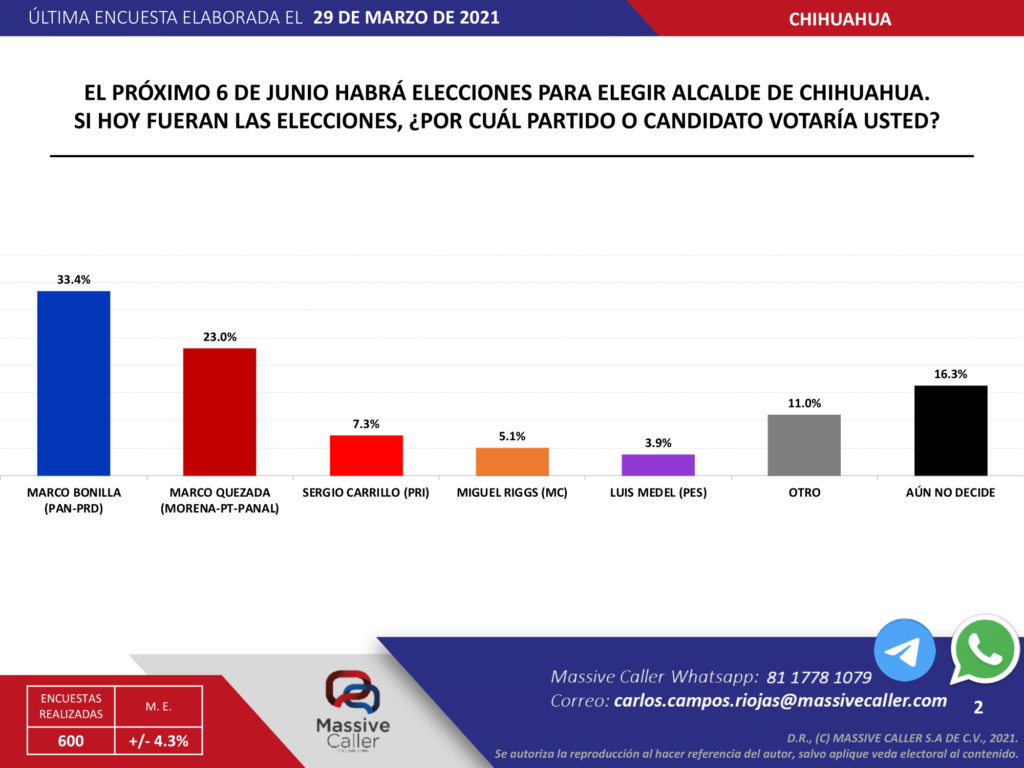 En Chihuahua capital, y a decir de la encuestadora en mención, quien lidera las preferencias electorales es Marco Bonilla, candidato del PAN-PRD, con el 33.4 por ciento, seguido por el aspirante de Morena, Marco Adán Quezada, con el 23 por ciento.
