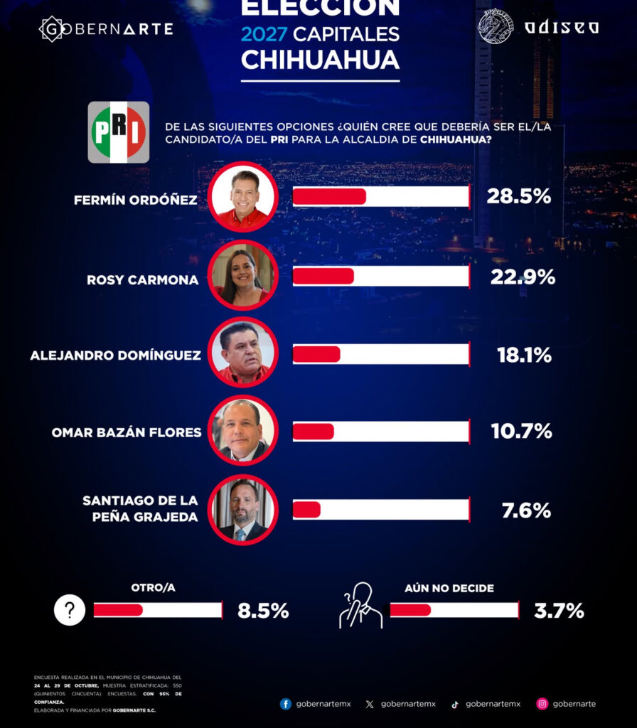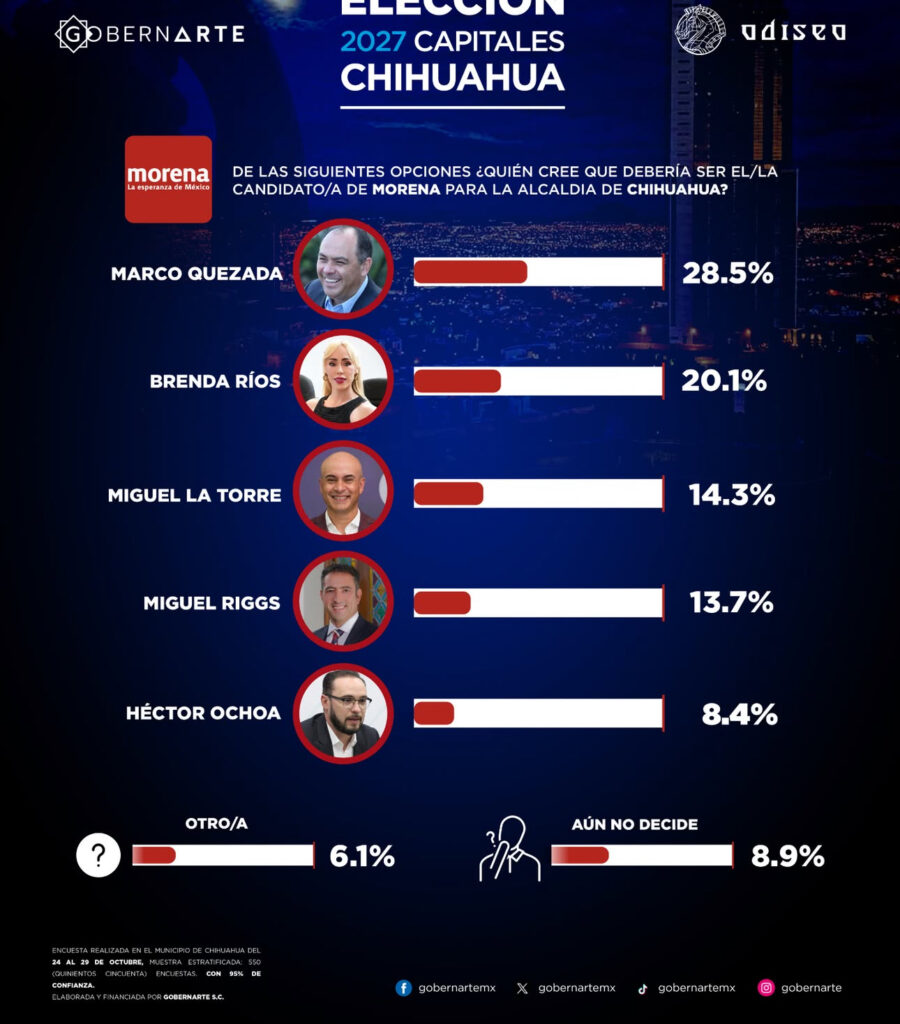 La más reciente encuesta de GobernArte respecto a las preferencias electorales como miras a renovar la alcaldía de Chihuahua capital en el 2027, señala que son el fiscal General César Jáuregui, por el PAN, el exalcalde Marco Quezada, por Morena y el dirigente estatal de Movimiento Territorial, Fermín Ordóñez, por el PRI, quienes encabezan las preferencias.