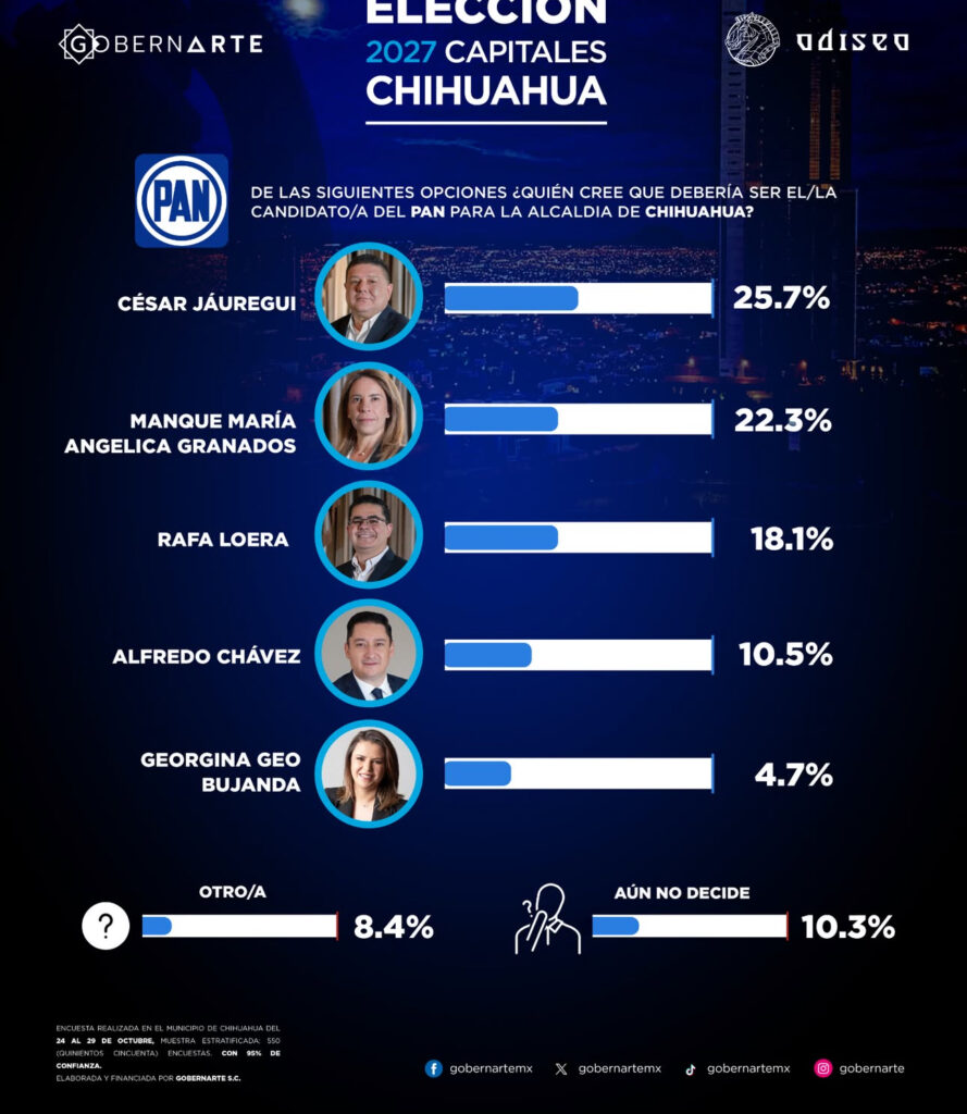 En el caso del PAN, en primer lugar está Jáuregui Moreno con el 25.7 por ciento, seguido por la diputada federal Manque Granados, el secretario de Desarrollo Humano y Bien Común de Gobierno del Estado, Rafael Loera, así como por el diputado local Alfredo Chávez y la exdiputada local Georgina Bujanda.