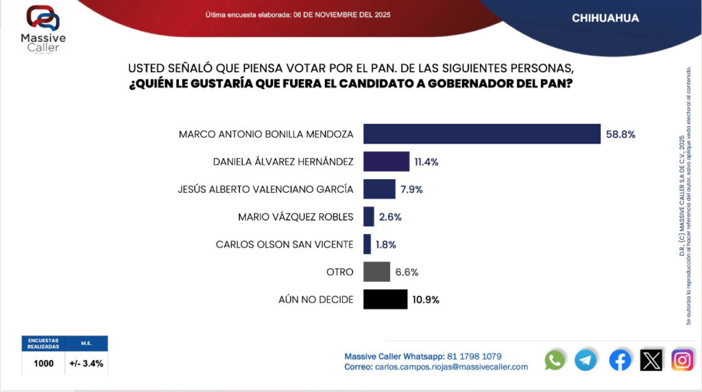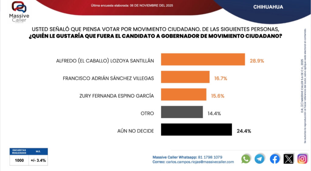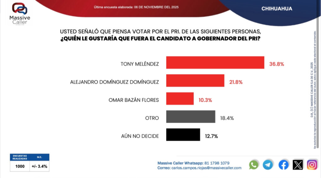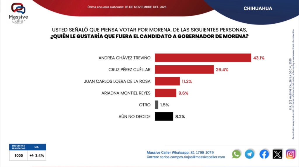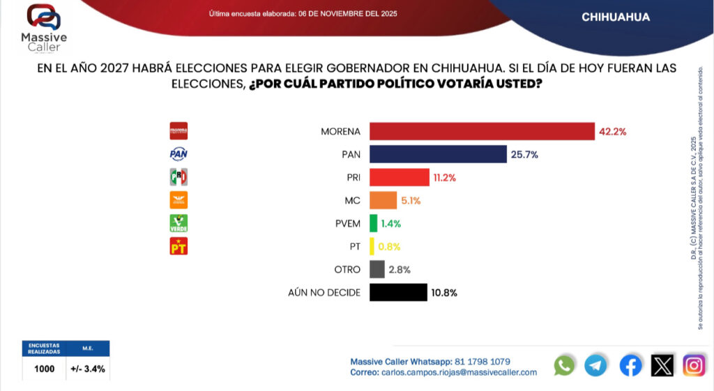 Massive Caller publicó su última encuesta respecto a las preferencias electorales para la gubernatura de Chihuahua en 2027, en donde Morena continúa a la cabeza, el PAN en segundo lugar y el PRI en tercero, mientras que Movimiento Ciudadano apareció en cuarto lugar.