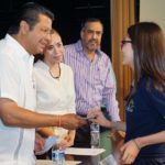 Junto al Presidente Municipal se encuentra Nancy Beltrán García, encargada del despacho de la Dirección de Educación; Patricia Salinas Vega, contralora; los regidores José Ávila Cuc y Pedro Matus, además de Alejandro Loaeza Cañizales, secretario Técnico.