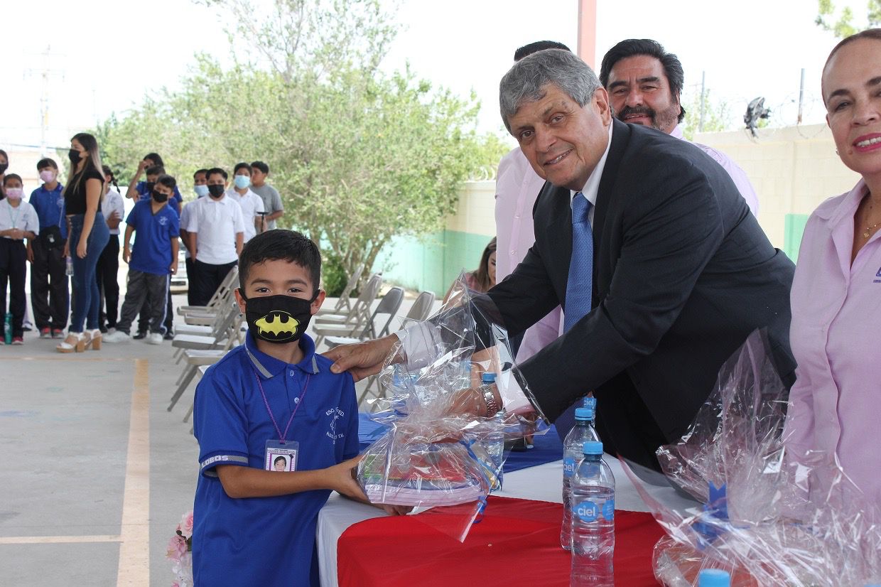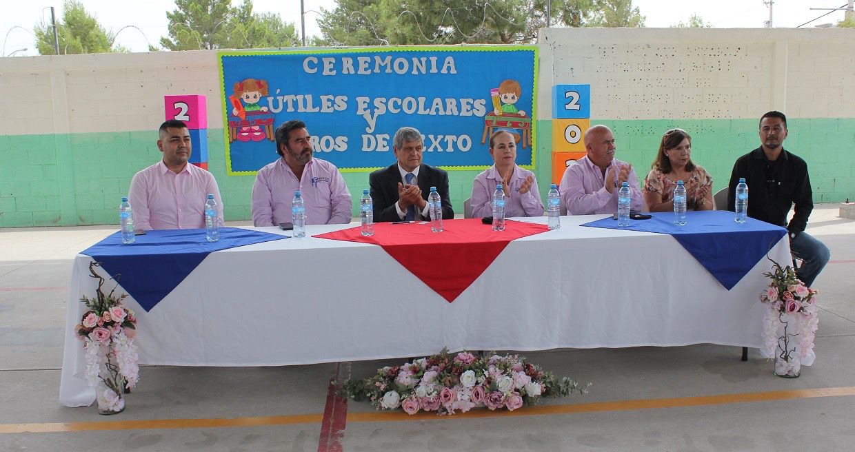 Antes, se realizó también la entrega de libros de texto y útiles escolares a estudiantes de las escuelas primarias federales: Escritores Chihuahuenses y José Rubio Ortega.