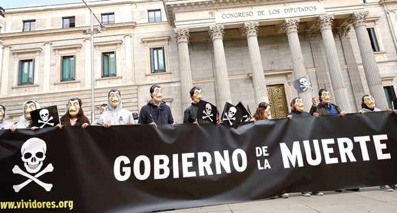 Un pequeño grupo de personas se reunió frente a la sede del Parlamento en Madrid ondeando banderas negras con calaveras para protestar contra el proyecto.
