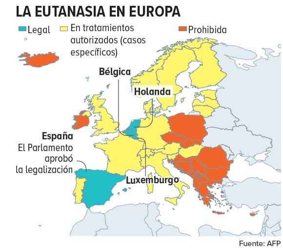 La eutanasia, cuando un médico administra directamente medicamentos letales a un paciente, es legal o lo autorizan las cortes en Bélgica, Canadá, Colombia, Luxemburgo y Holanda. Suiza y algunos estados de EU permiten el suicidio médicamente asistido, es decir, cuando el paciente toma medicamentos letales bajo supervisión médica.