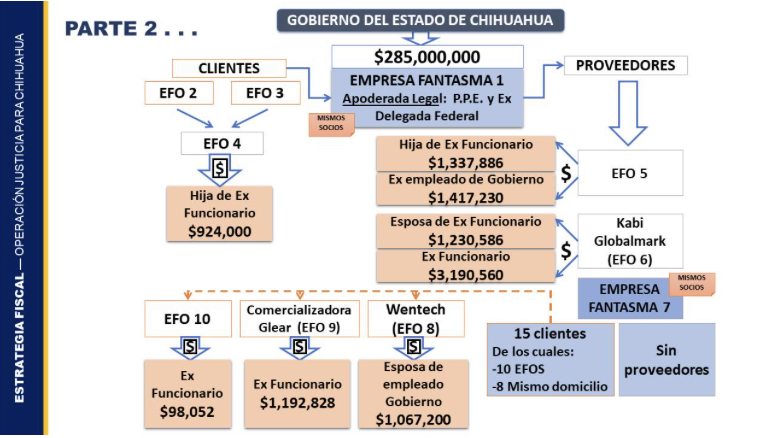 Con este esquema, transfirieron 285 millones de pesos (mdp) del Gobierno del Estado a una empresa fantasma (EFO1), que a su vez transfirió a otra EFO (2) recursos por 2 mil 750 mdp, contando con apenas 15 clientes y sin contar con proveedores.