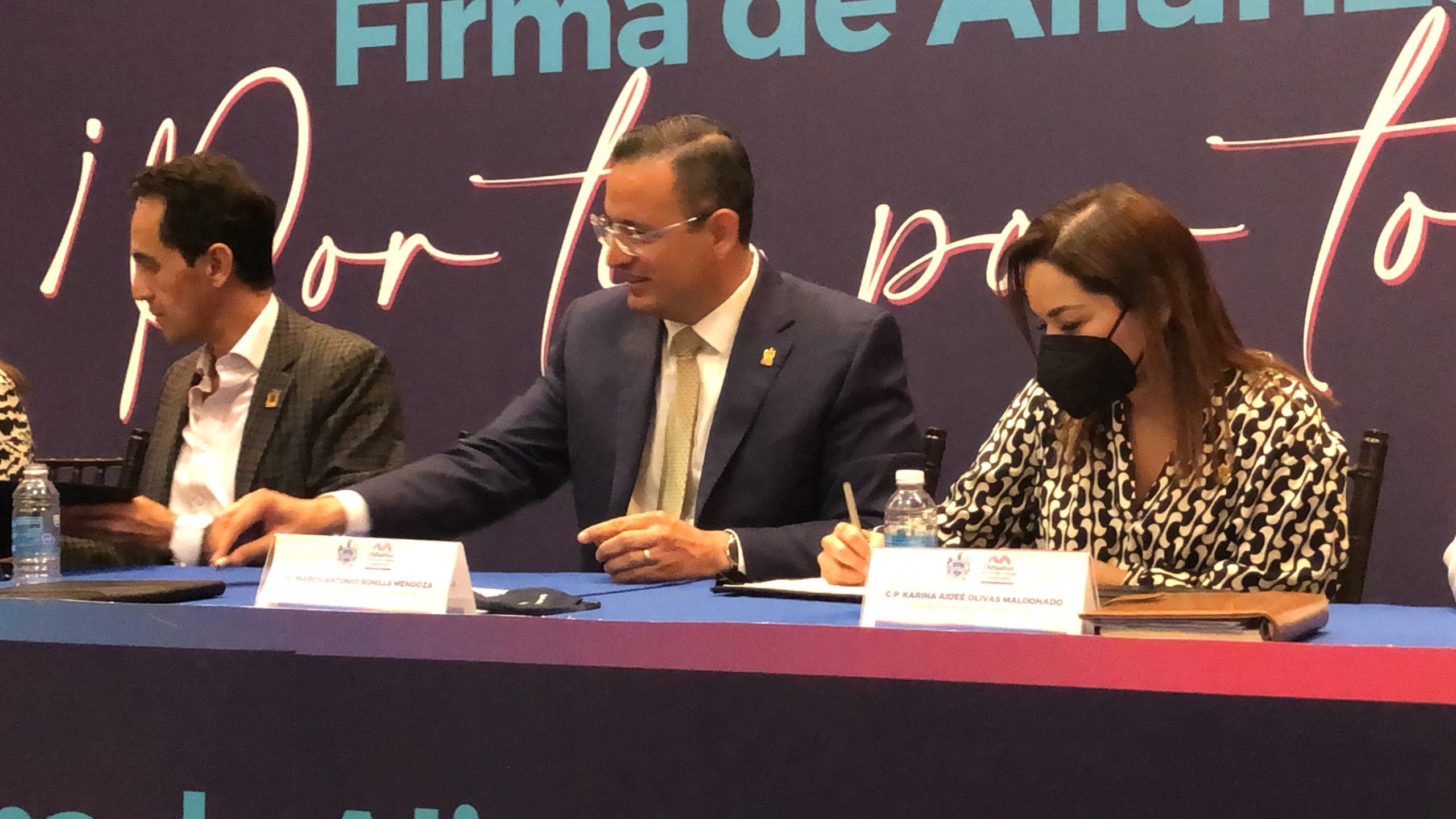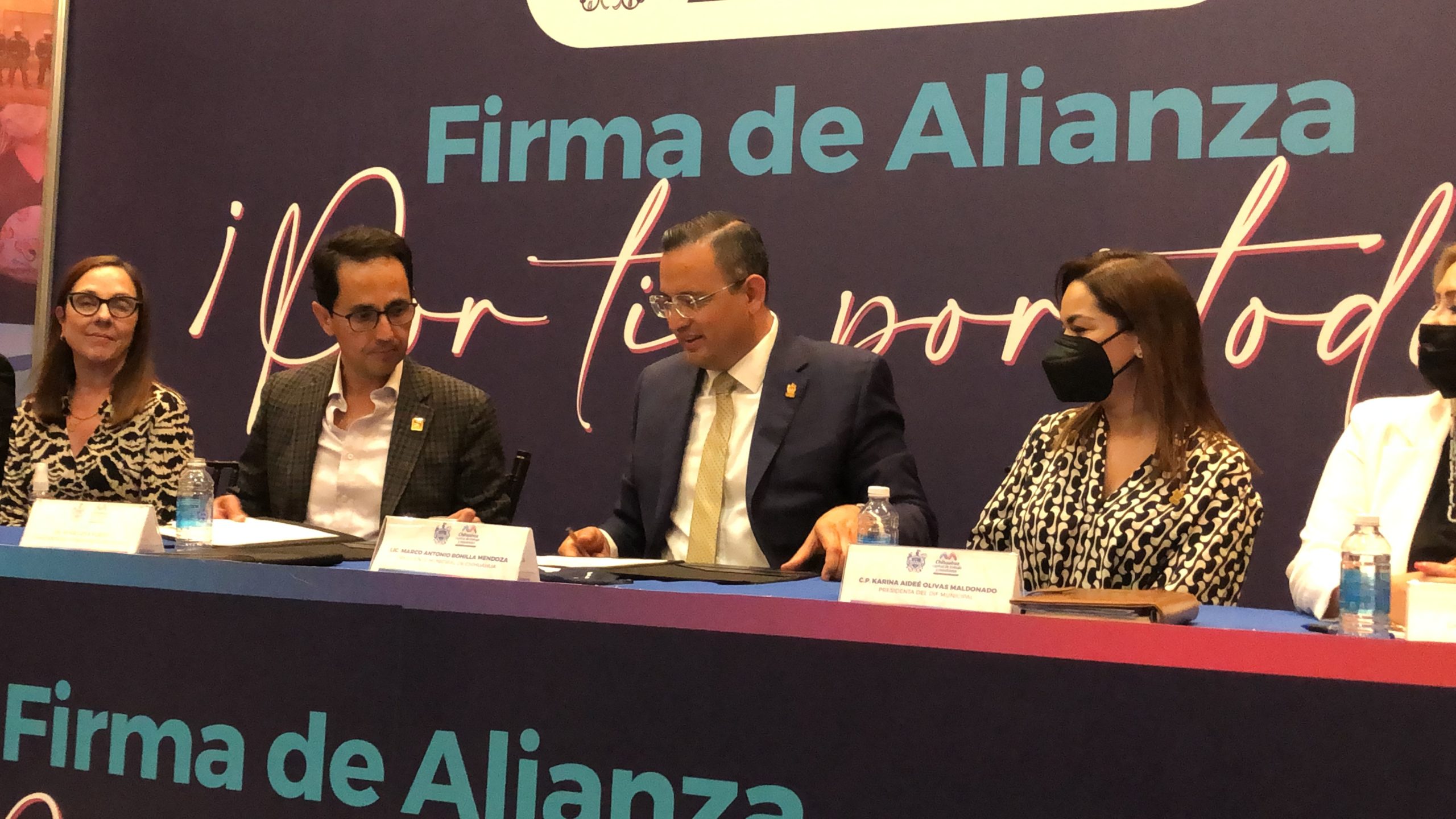 Esta mañana el presidente municipal Marco Bonilla Mendoza, acompañado por su esposa Karina Olivas y el presidente de Fechac, Hugo Loya, realizaron la firma de Convenio “Alianza por ti, por todos”, esto en el hotel Quality Inn.