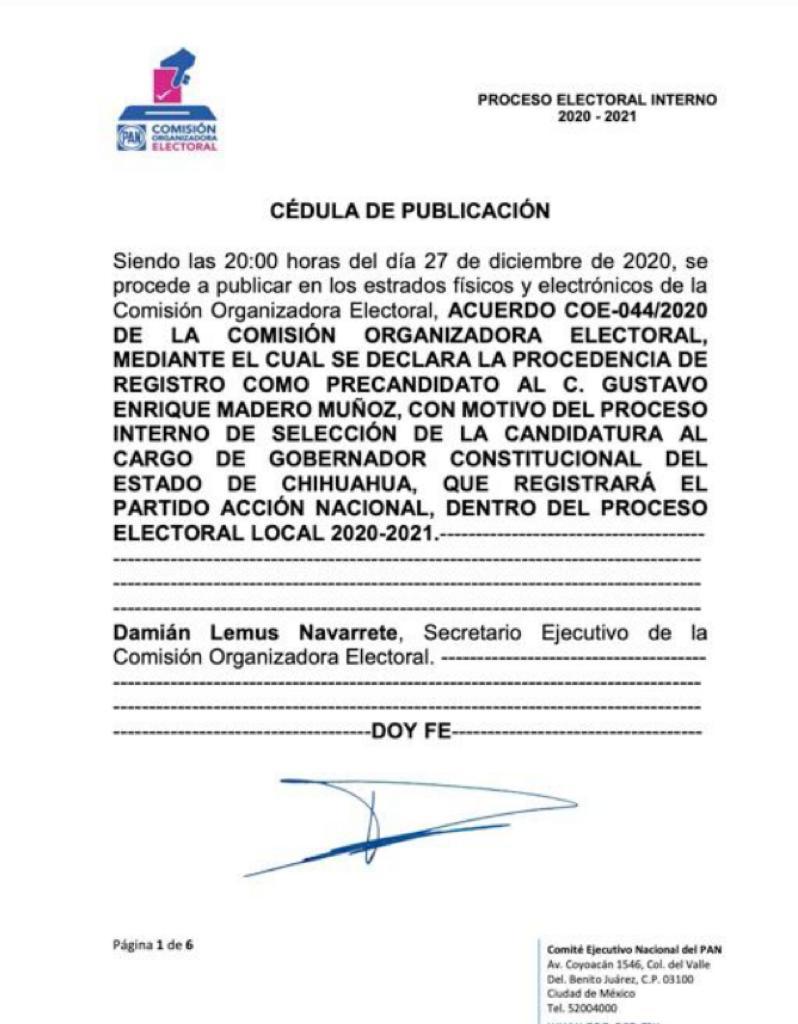 La Comisión Organizadora Electoral determinó que tanto Madero Muñoz y Campos Galván acreditaron el cumplimiento de la totalidad de los requisitos establecidos en la convocatoria, con lo que se avala su participación en la precampaña que dará inicio el próximo domingo 3 de enero.