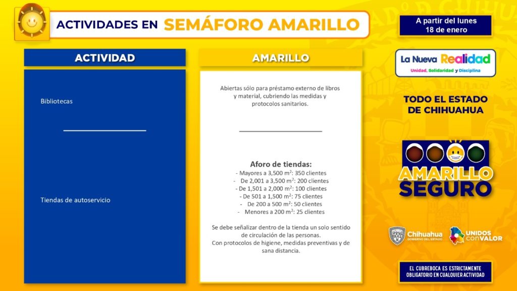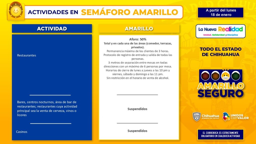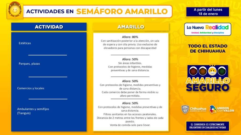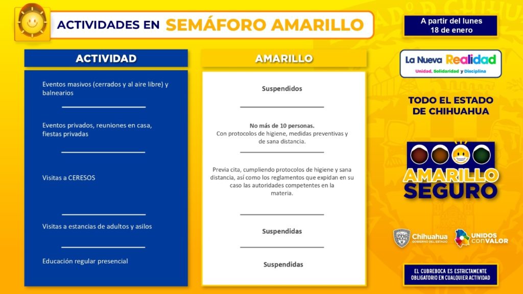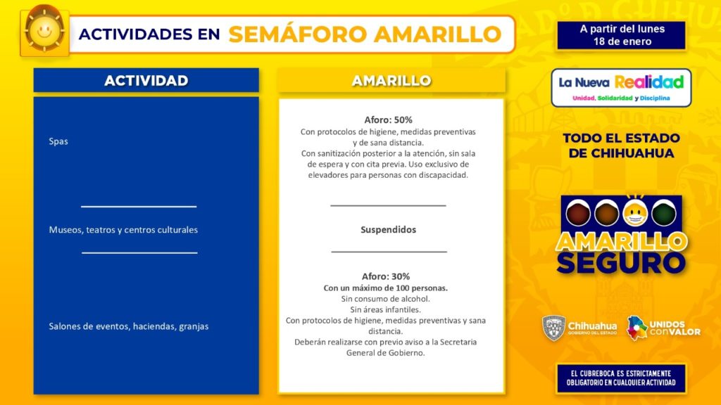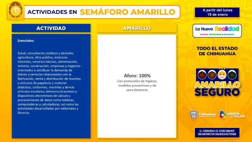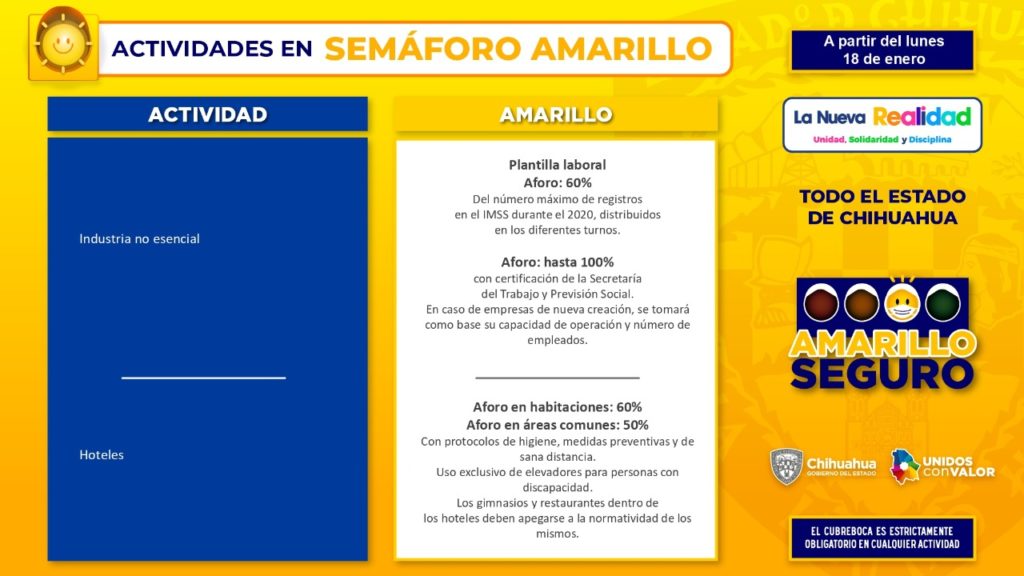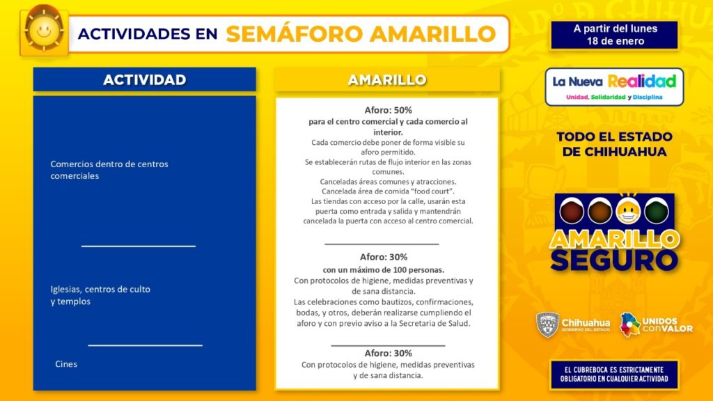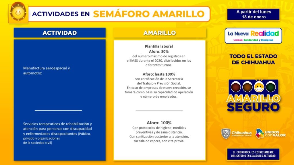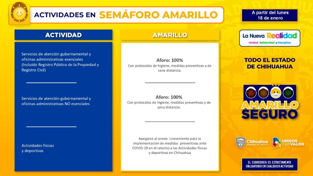 Una novedad para el semáforo Amarillo Seguro, es la desagregación del riesgo por actividad física, que elaboraron en conjunto el Instituto Chihuahuense del Deporte y representantes de la iniciativa privada, resaltó.