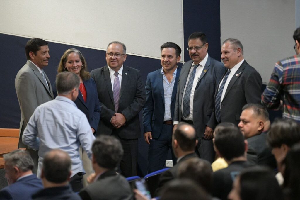 En el presídium estuvieron, además del Rector y el Director de la FI, el Secretario de Obras Públicas de Gobierno del Estado, M.I. Jorge Chánez Peña, quien impartió la conferencia inaugural; el Ing. Juan Carlos Montaño Arreola, Secretario de la Cámara Mexicana de la Industria de la Construcción y el Mtro. Arion Juárez Menchaca, Secretario Académico de la Facultad de Ingeniería.