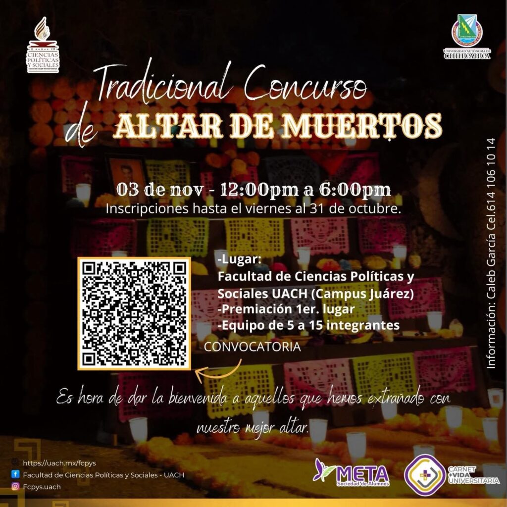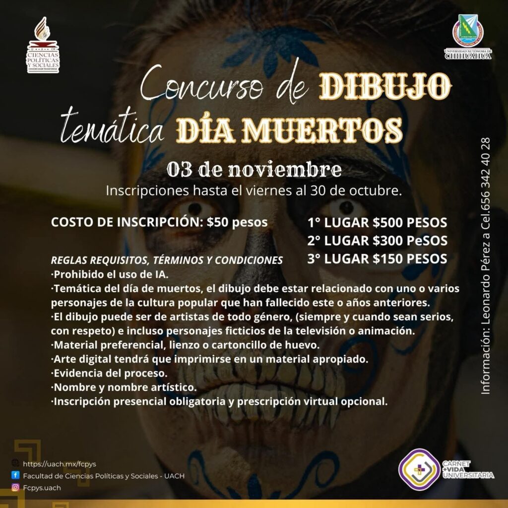 Ambas convocatorias forman parte de las actividades culturales de la Facultad de Ciencias Políticas y Sociales de la UACH, con el apoyo de META Sociedad de Alumnos y el programa Carnet Vida Universitaria. Para más información, los interesados pueden comunicarse con Leonardo Pérez al 656 342 4028 sobre el concurso de dibujo, o con Caleb García al 614 106 1014 para el concurso de altar.