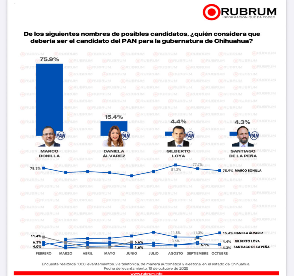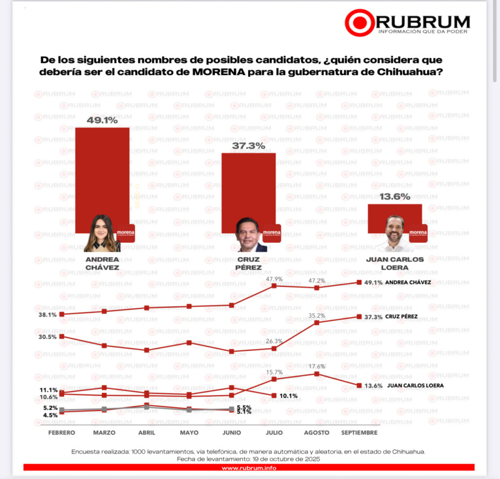 La encuestadora RUBRUM publicó su más reciente ejercicio estadístico respecto a las preferencias electorales con rumbo a la gubernatura de Chihuahua, en donde Morena se ubicó en primer lugar, el PAN en segundo lugar, el PRI en tercero y en cuarto lugar está Movimiento Ciudadano.