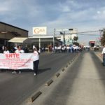 Maestros pertenecientes al Sindicato Nacional de Trabajadores de la Educación (SNTE) marcharon esta mañana de la glorieta Pancho Villa a la Plaza Mayor, en defensa de la educación pública.