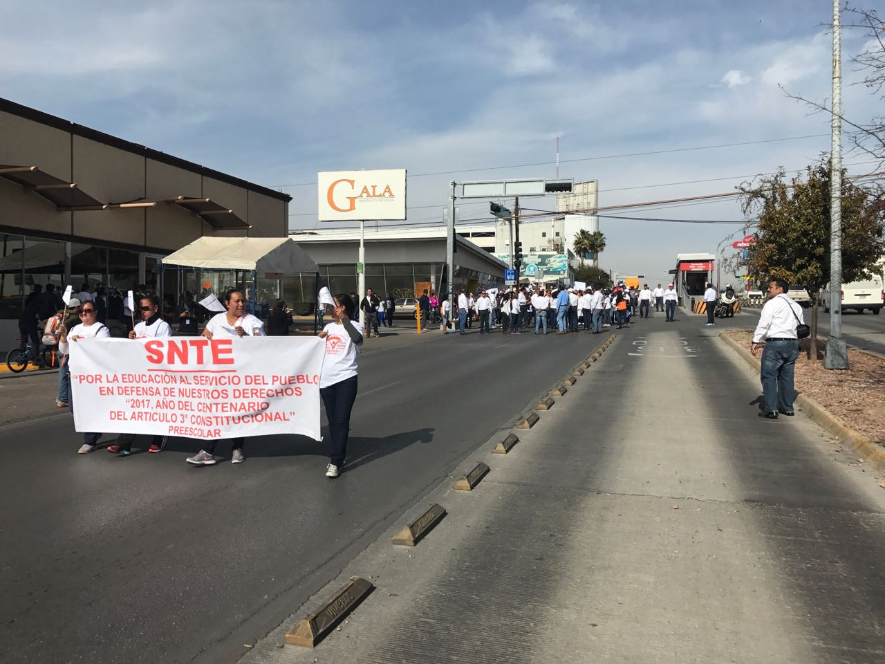 Maestros pertenecientes al Sindicato Nacional de Trabajadores de la Educación (SNTE) marcharon esta mañana de la glorieta Pancho Villa a la Plaza Mayor, en defensa de la educación pública.
