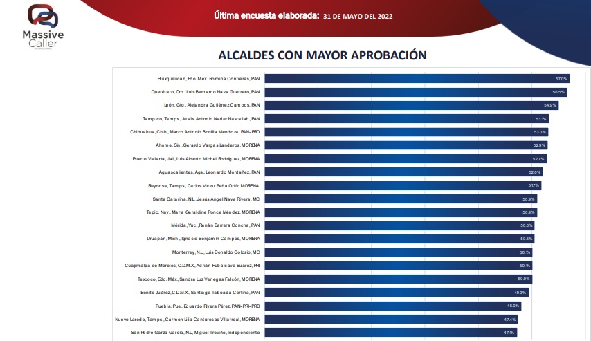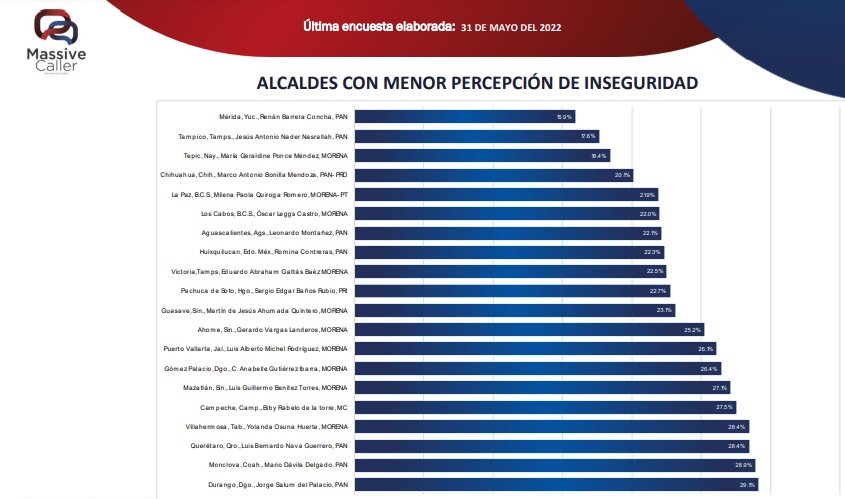 La encuesta nacional de Massive Caller dio a conocer su lista mensual de encuestas por municipios, en esta ocasión por mayor aprobación ciudadana y menos percepción de seguridad correspondiente al mes de mayo, en donde resalta el alcalde capitalino, Marco Antonio Bonilla Mendoza.