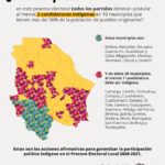 Como parte de estas acciones que buscan la presencia indígena en la postulación de candidaturas, sobre todo en los municipios con un alto porcentaje de habitantes de pueblos originarios, también se obliga a respetar la igualdad entre las candidaturas de hombres y mujeres, es decir, en aquellos casos en que postulen dos candidaturas indígenas, al menos una, con su respectiva suplencia, deberá ser encabezada por una persona del género femenino.