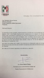 En la carta, el dirigente del partido tricolor argumenta que sería un duro golpe para los ciudadanos de Madera, pues BBVA Bancomer es el único banco que existe en la cabecera municipal y el más cercano se encuentra a 170 kilómetros de distancia, en el municipio de Cuauhtémoc.