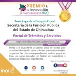 Noticias de Chihuahua.-El Portal de Trámites y Servicios del Gobierno del Estado de Chihuahua fue reconocido con el tercer lugar de la categoría estatal del Premio Nacional a la Innovación en Transparencia 2020, otorgado por el INAI, por su compromiso con la participación ciudadana para la rendición de cuentas.