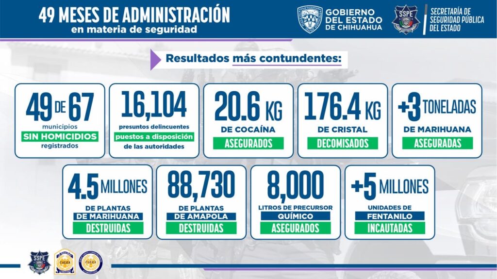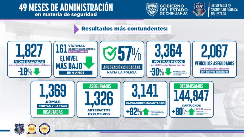 En estos 49 meses de trabajo, la SSPE consolida una institución más fuerte, profesional y cercana a la ciudadanía, guiada por los principios de proteger con dignidad, actuar con legalidad y servir con convicción, reafirmando su compromiso de construir un Chihuahua seguro, justo y con una policía que inspire confianza y respeto.