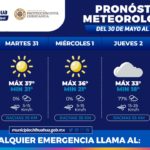 La Coordinación Municipal de Protección Civil, informa que las temperaturas durante la semana se tendrán días calurosos por lo que es importante no permanecer por tiempos prolongados bajo los rayos del sol, a fin de prevenir deshidrataciones u otras complicaciones de salud, asimismo se informa que se esperan lluvias los días jueves y viernes.