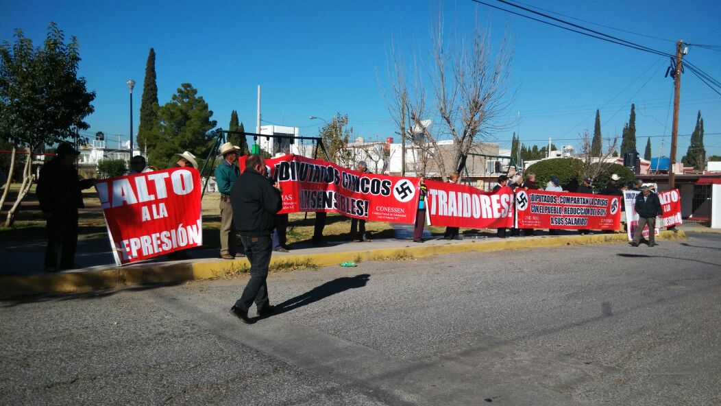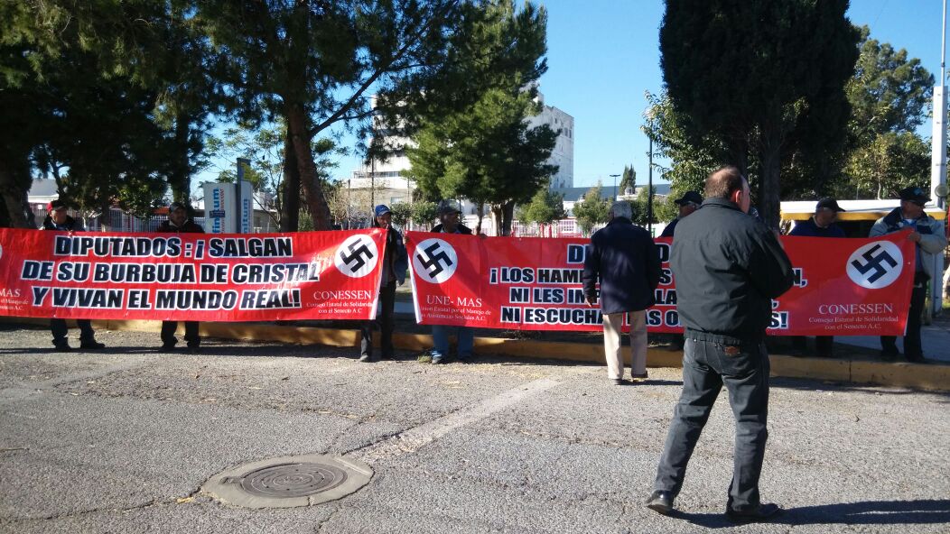 Con consignas alusivas a la traición y a la hipocresía, los adultos mayores indicaron que continuarían manifestándose en las casas de enlace de los diputados federales del PRI y el PAn que aprobaron esta liberación de precios.