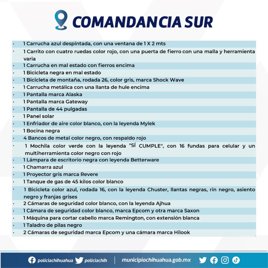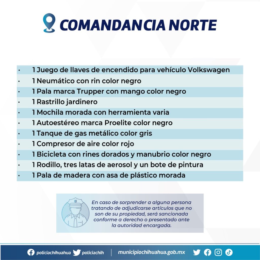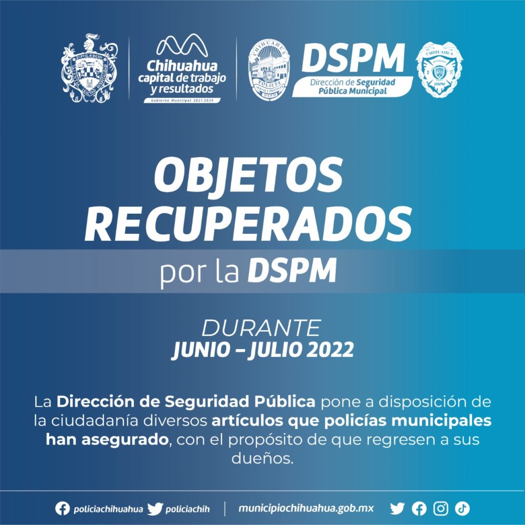 Con el objetivo entregar a sus dueños los artículos que han sido recuperados por policías municipales durante los patrullajes ordinarios o al realizar detenciones en calle, la Dirección de Seguridad Pública Municipal (DSPM) da a conocer el listado correspondiente, que a partir de esta fecha se encuentra pegado en las áreas de acceso al público de las Comandancias Norte y Sur, ubicadas en las avenidas Homero y Pacheco, respectivamente.