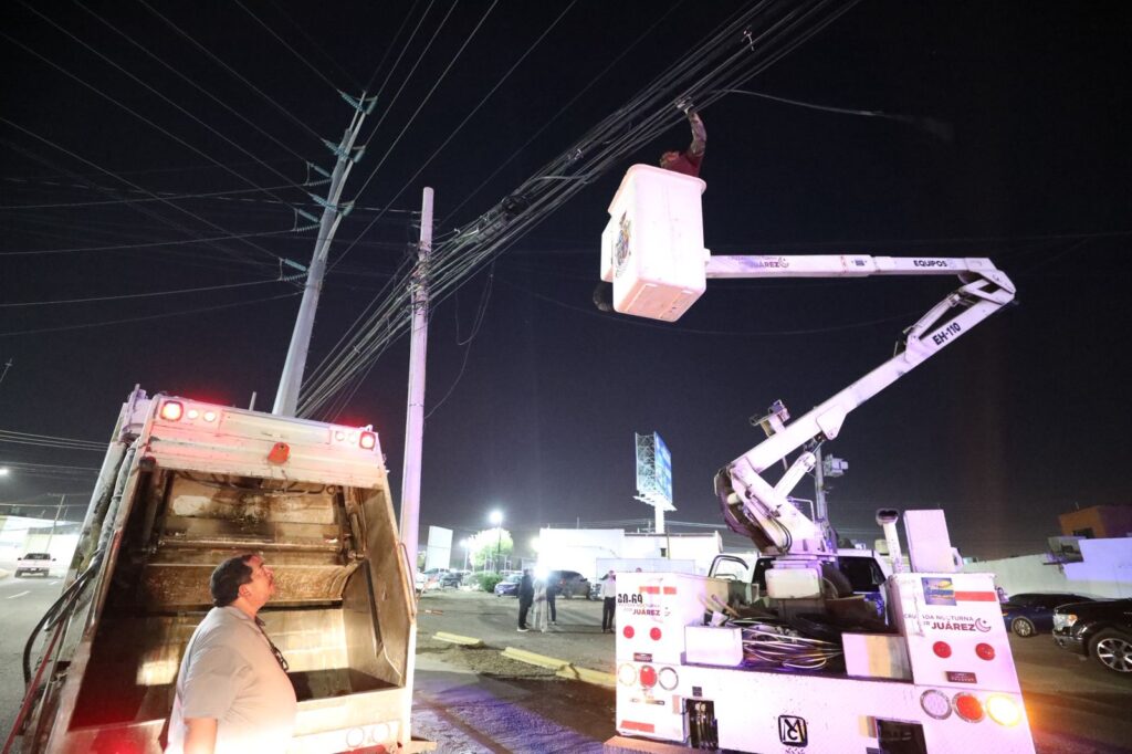 Un total de 2.5 kilómetros del bulevar Tomás Fernández fueron intervenidos durante la Cruzada Nocturna número 37, donde cuadrillas municipales rehabilitaron 111 luminarias, limpiaron más de 600 metros cuadrados de graffiti, retiraron 132 llantas y levantaron 18 toneladas de tierra, basura y hierba, como parte del programa permanente de mejoramiento urbano que impulsa el Gobierno Municipal de Ciudad Juárez.