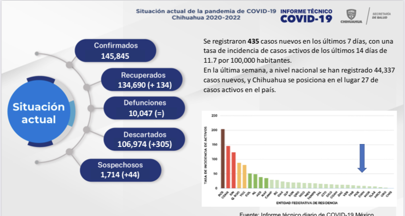 A nivel nacional se registraron 44 mil 337 casos nuevos y el estado de Chihuahua se posiciona en el lugar 27 de casos activos en el país, por lo que presenta una tasa de incidencia de los últimos 14 días, de 11.7 casos activos por cada 100 mil habitantes.