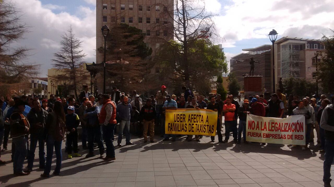 Taxistas agremiados a diferentes organizaciones y sindicatos de la capital, se manifestaron la mañana de este jueves a las afueras del Congreso del Estado de Chihuahua, a fin exponer su descontento en relación a la posible legislación que de entrada legal a las empresas de redes de transporte como lo es Uber.