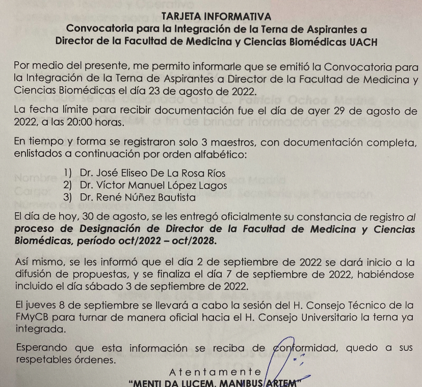 Por lo que será el jueves 8 de septiembre, cuando se reúna el Consejo Técnico de la Facultad de Medicina y enviar la terna al Consejo Universitario de la UACH.