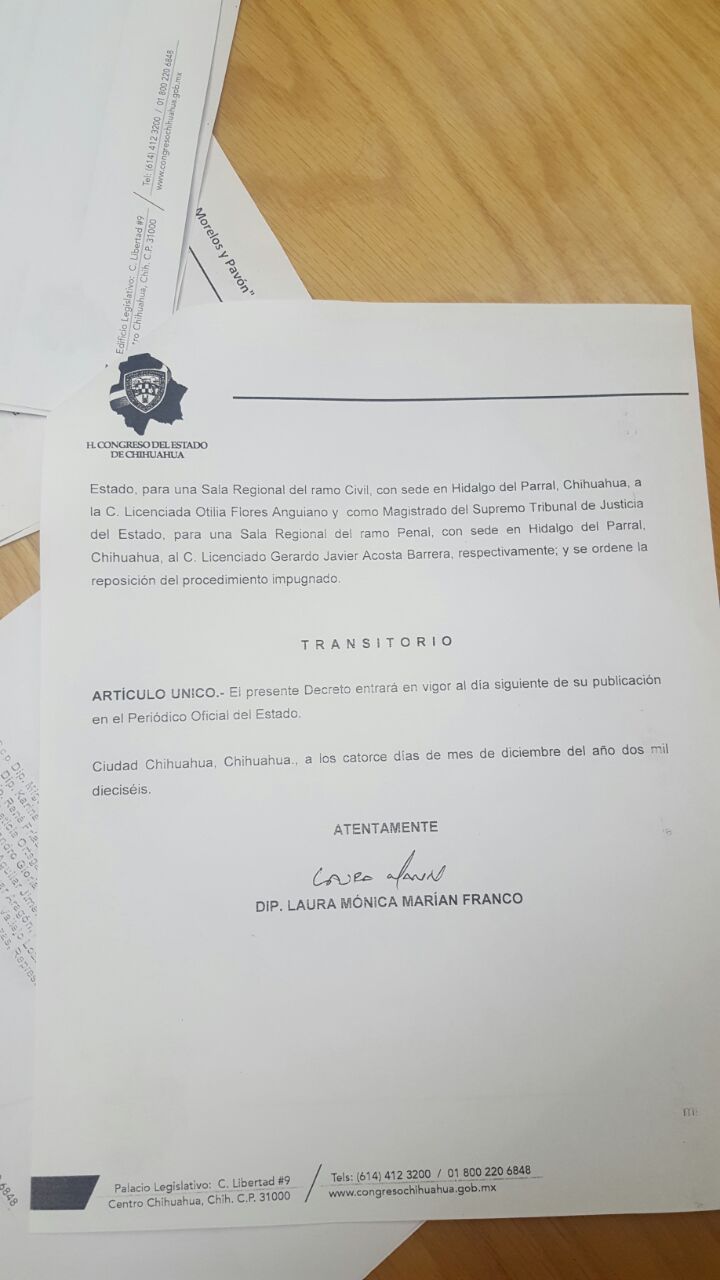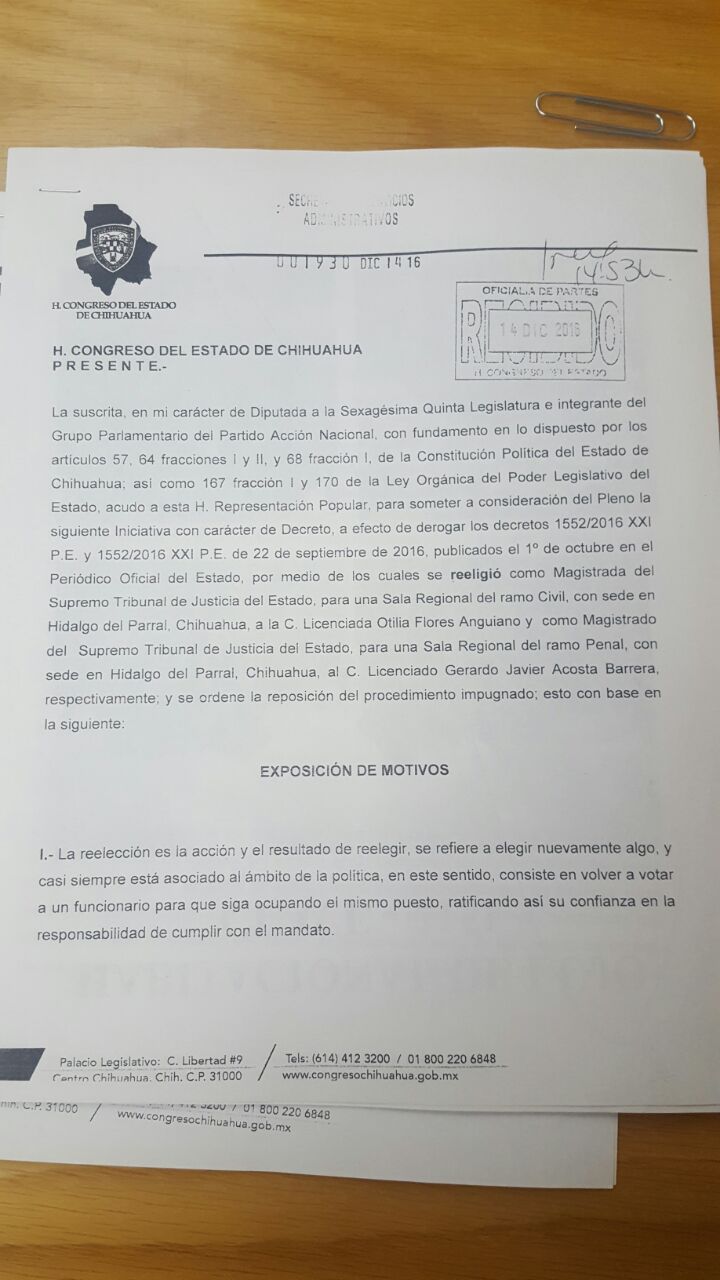 La diputada panista Laura Marín, presentará ante el Congreso del Estado una iniciativa con carácter de decreto a efecto de derogar los decretos por medio de los cuales se reeligió como magistrados del Tribunal Superior de Justicia del Estado, para una sala Regional del ramo Civil y penal, respectivamente, con sede en Hidalgo del Parral, a la licenciada Otilia Flores Anguiano y a Gerardo Javier Acosta Barrera y que se ordene reposición del procedimiento impugnado, debido a que, según expone en su documento, la Sexagésima Cuarta Legislatura se adelantó al nombramiento.