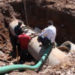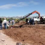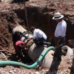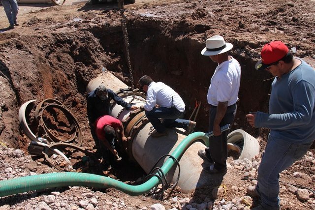 Para la rehabilitación de la tubería dañada por trabajos de una desarrolladora inmobiliaria, los empleados de la JMAS procedieron a instalar un carrete en 1.5 metros de línea sujeto con juntas “gibault”.