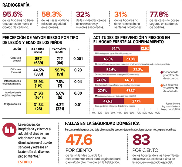 De acuerdo con una encuesta realizada por Alma Cruz Bañares, directora de México Unido Libre de Lesiones Infantiles, A.C., y Adriana Villafuerte García, doctorante en Salud Pública por el Instituto Nacional de Salud Pública, si bien los padres o cuidadores tienen una mayor percepción de riesgo o preocupación por determinados tipos de lesiones en el contexto de la pandemia, por el mayor tiempo que los niños pasan en sus casas, esto no necesariamente conlleva a acciones para prevenirlas.