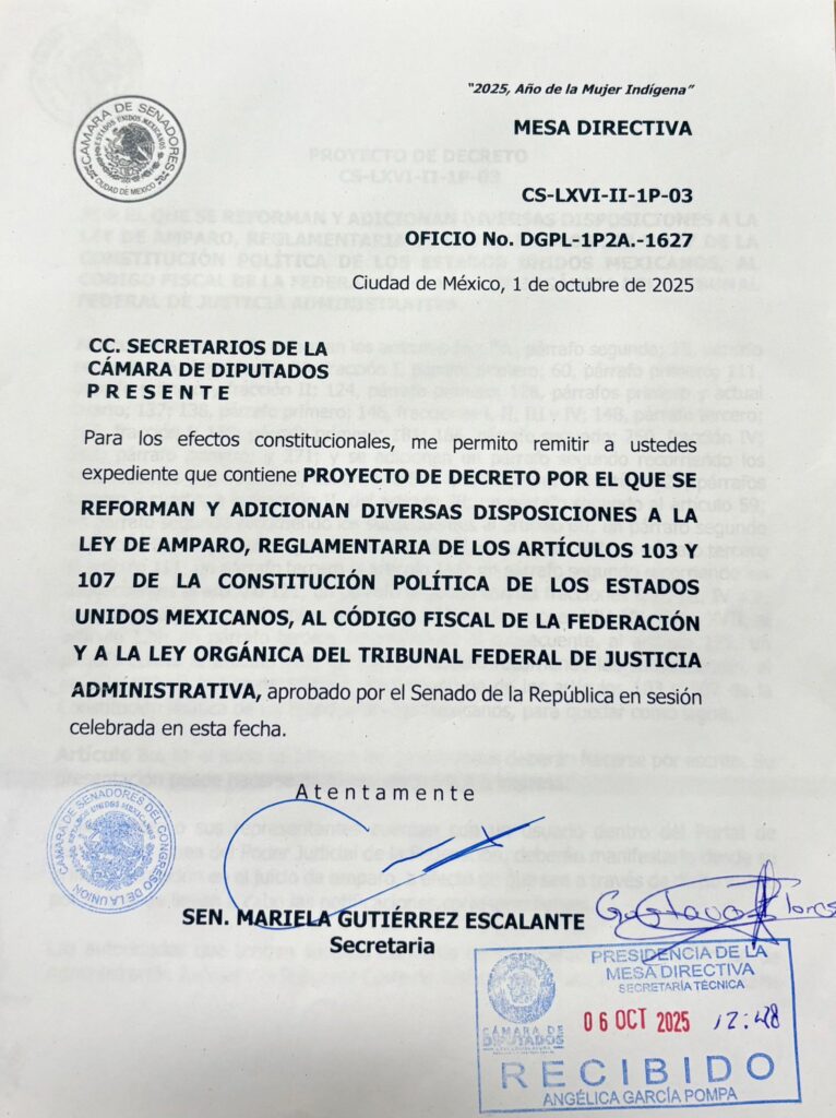 La Cámara de Diputados recibió del Senado la minuta con proyecto de decreto por el que se reforman y adicionan diversas disposiciones a la Ley de Amparo, Reglamentaria de los artículos 103 y 107 de la Constitución Política de los Estados Unidos Mexicanos, al Código Fiscal de la Federación y a la Ley Orgánica del Tribunal Federal de Justicia Administrativa.