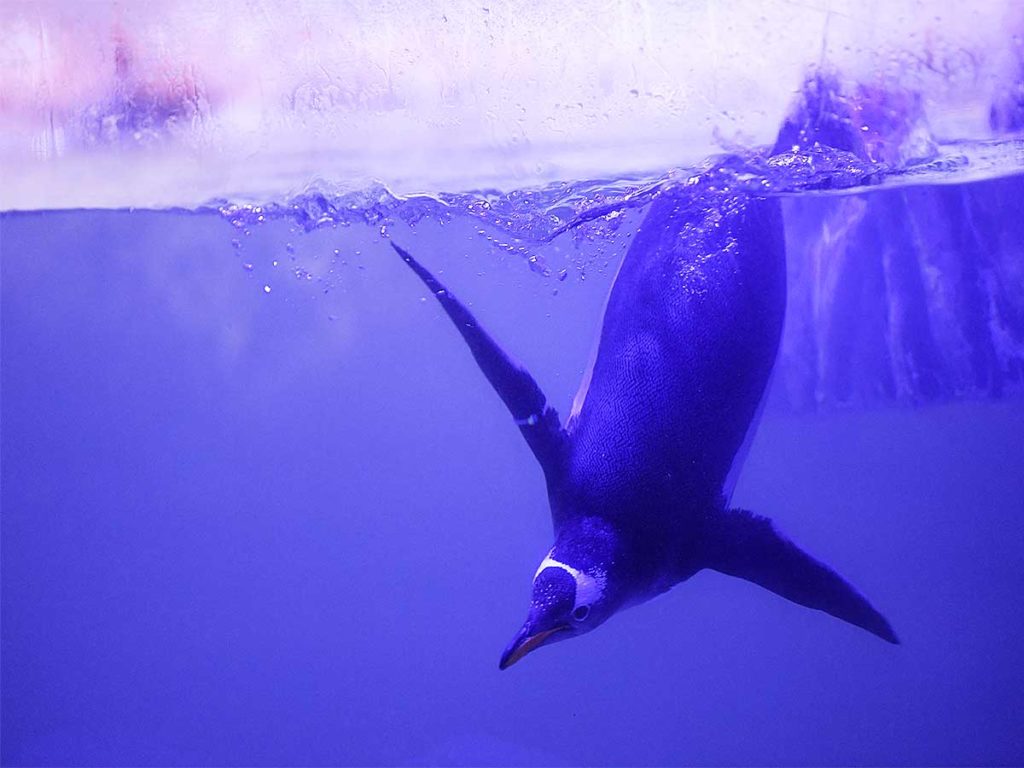 A Gentoo penguin (Pygoscelis papua) is seen at an Antarctic environment recreated at the Inbursa Aquarium, in Mexico City, on January 8, 2021. – A penguin, a subantarctic seabird, was born in an aquarium in Mexico, becoming the first specimen of that species reproduced in captivity in the Latin American country. (Photo by PEDRO PARDO / AFP) -
