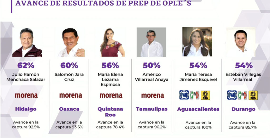 El muestreo estadístico oficial del Instituto Nacional Electoral (INE) reveló que Morena triunfó en Hidalgo, Oaxaca, Quintana Roo y Tamaulipas, mientras que la alianza opositora “Va por México” retuvo Aguascalientes y Durango, tal como vaticinaban las encuestas.